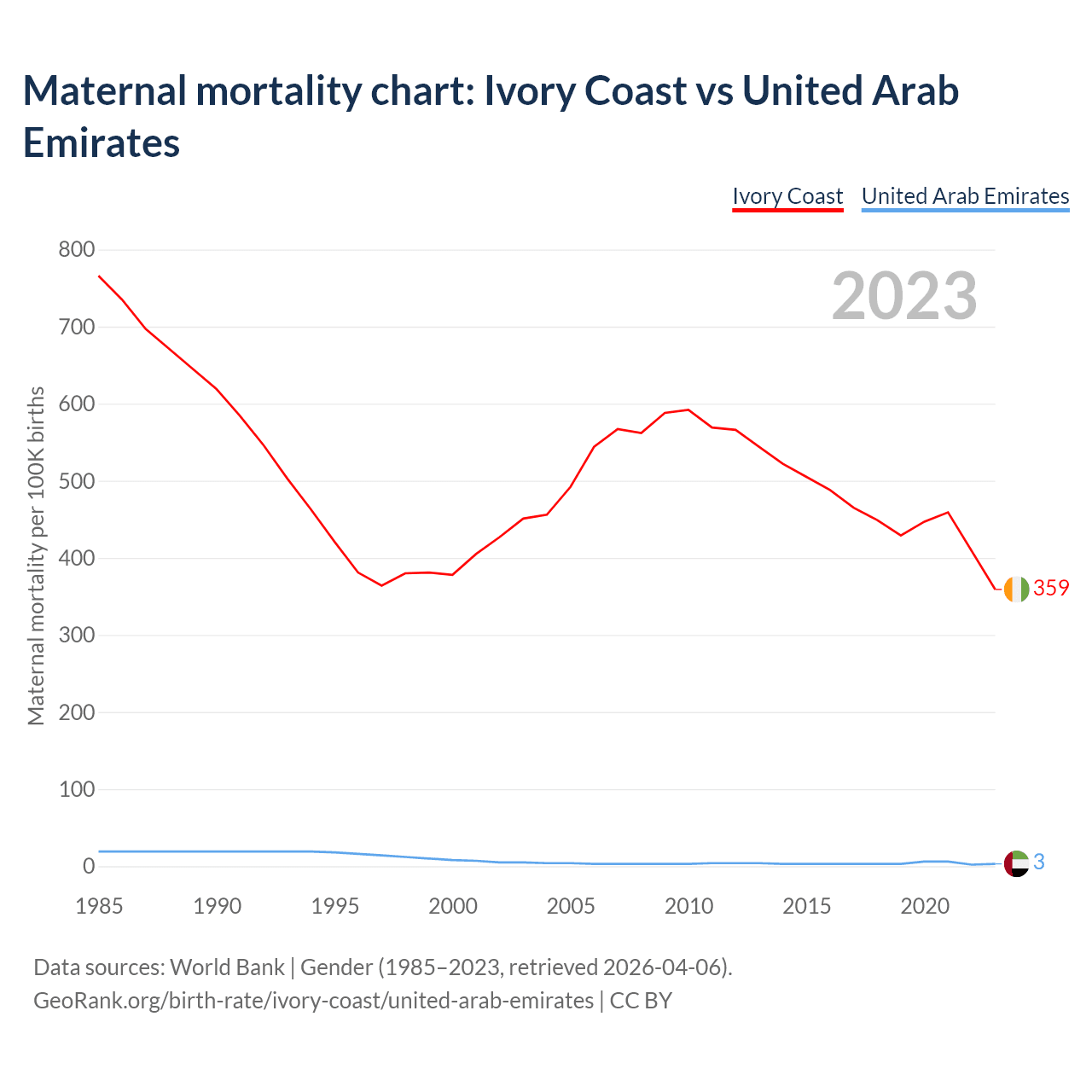 The maternal mortality rate, which is the probability of dying during childbirth or within 42 days of pregnancy termination, is 359 deaths per 100,000 live births in Ivory Coast, compared to 3 deaths in the United Arab Emirates.