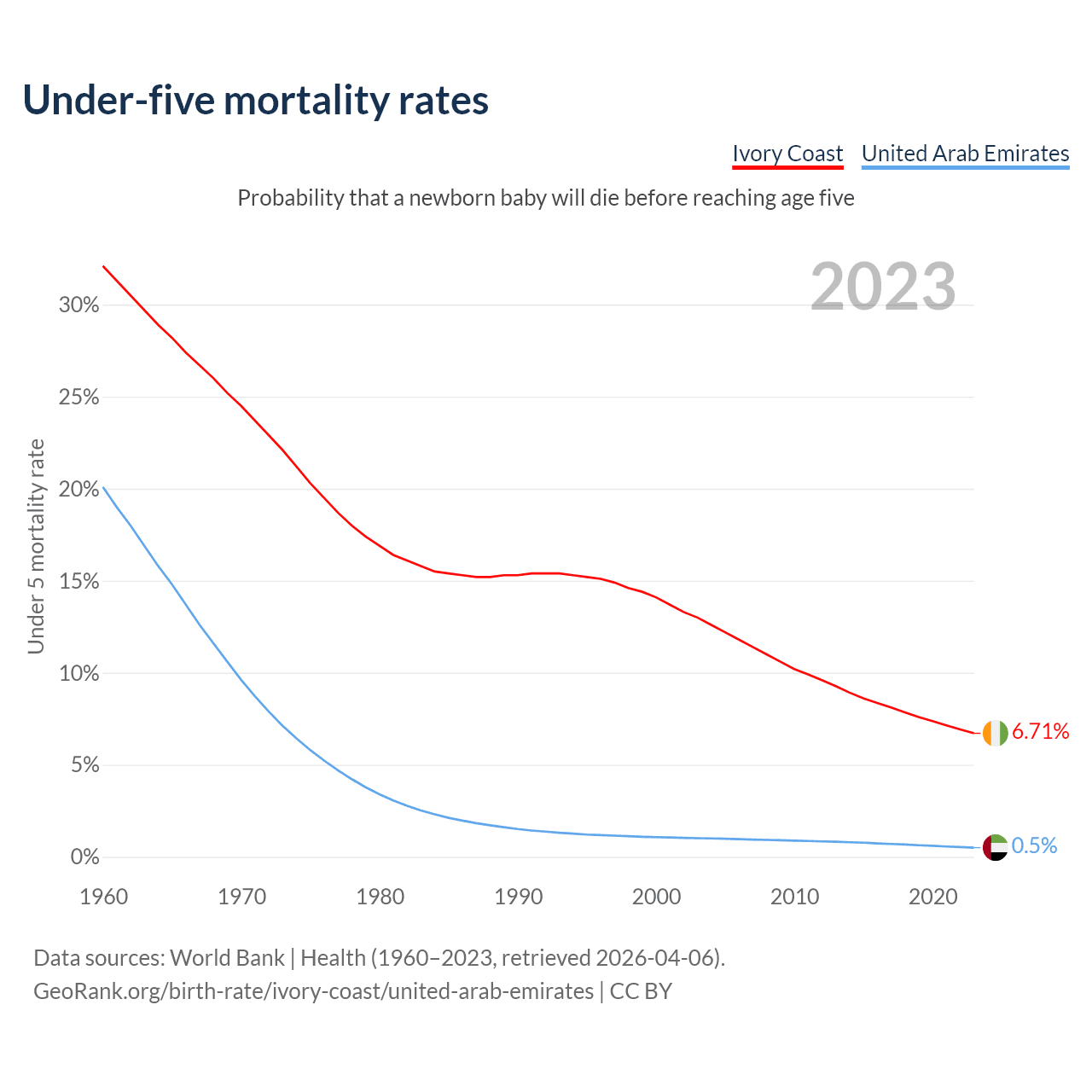 The chance that a newborn baby will die before reaching age five is 6.71% in Ivory Coast and 0.5% in the United Arab Emirates. Above is a chart with historical data on under-five mortality rates.