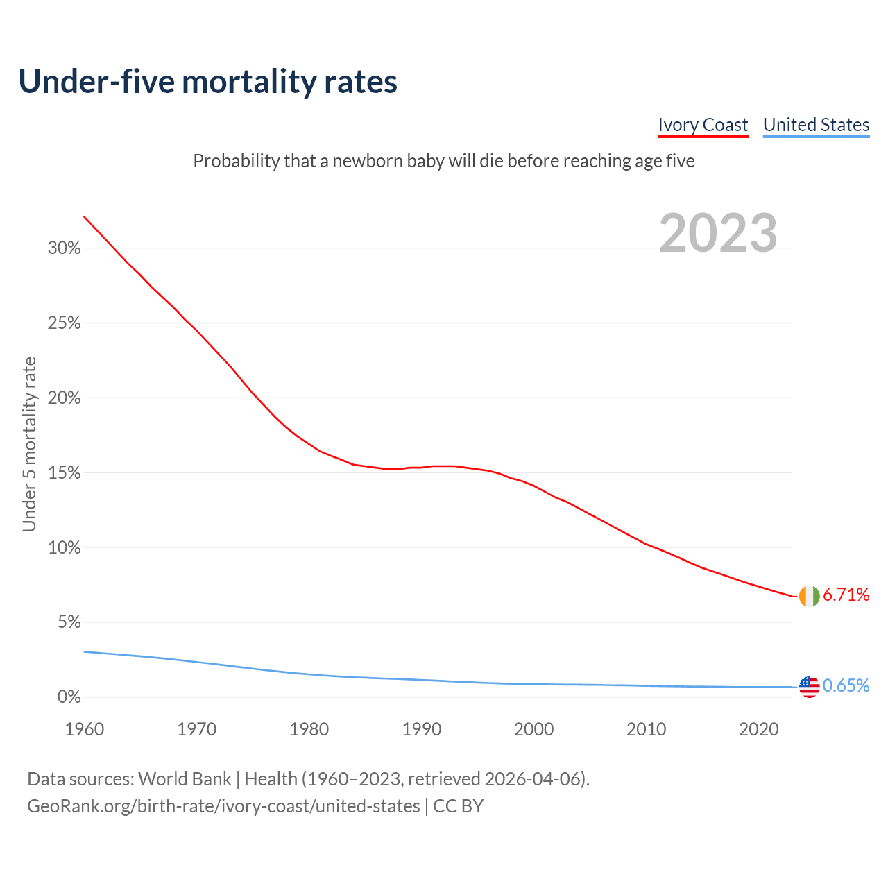 The chance that a newborn baby will die before reaching age five is 6.71% in Ivory Coast and 0.65% in the United States. Above is a chart with historical data on under-five mortality rates.