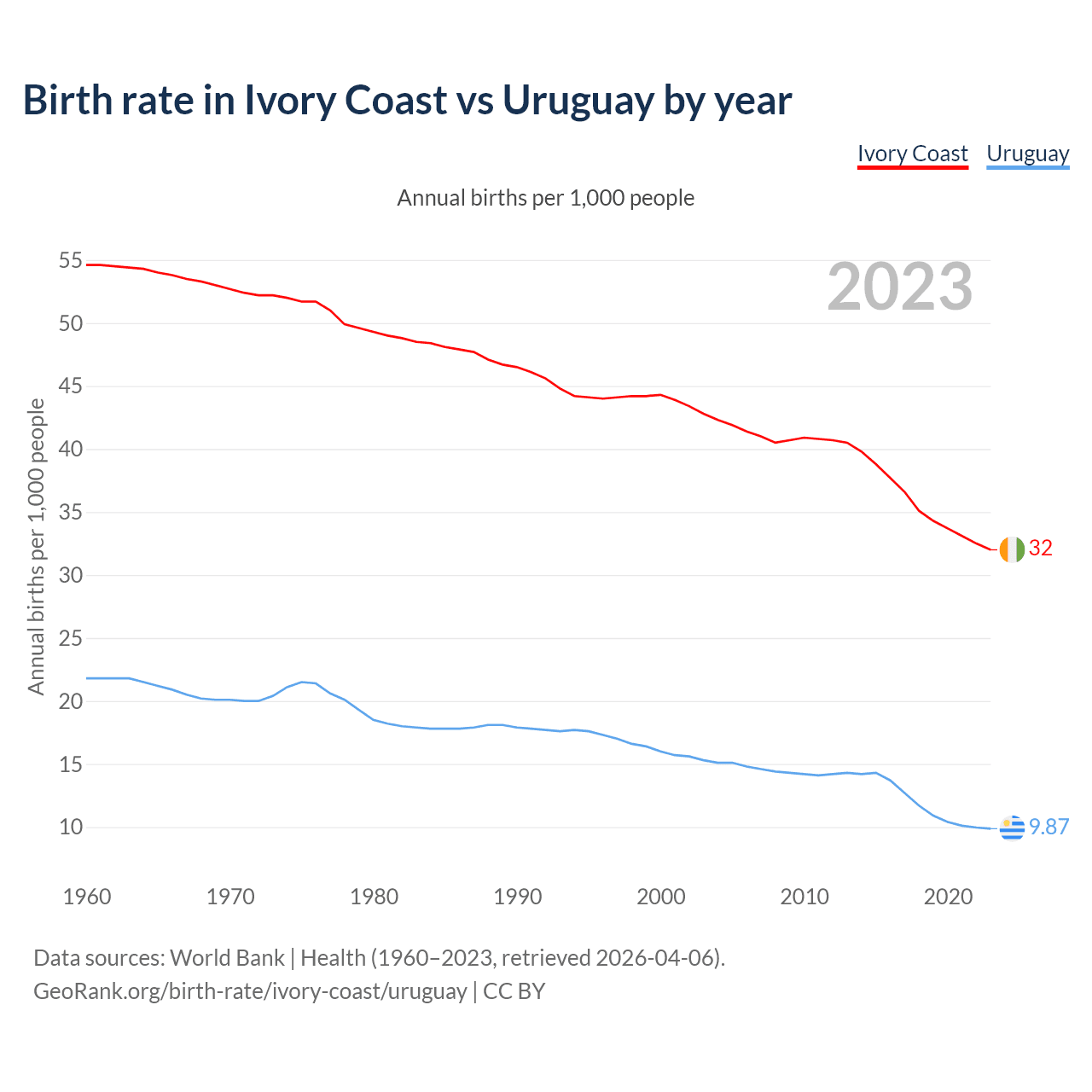 GeoRank.org/birth-rate/ivory-coast/uruguay | CC BY