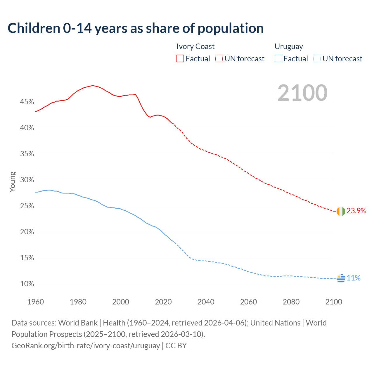 Ivory Coast has an annual birth rate of 32 births per 1,000 people, compared to 9.87 for Uruguay. The average number of children a woman is expected to have during her lifetime — the fertility rate, is 4.28 in Ivory Coast and 1.41 in Uruguay — 67.1% difference.