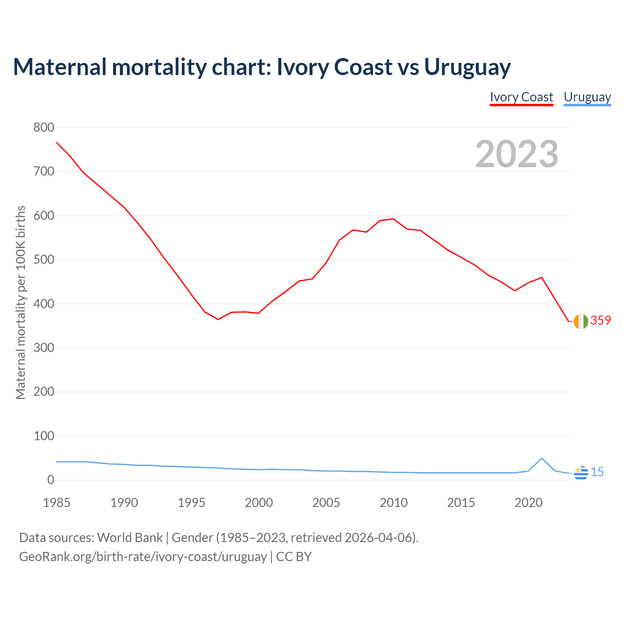 The maternal mortality rate, which is the probability of dying during childbirth or within 42 days of pregnancy termination, is 359 deaths per 100,000 live births in Ivory Coast, compared to 15 deaths in Uruguay.