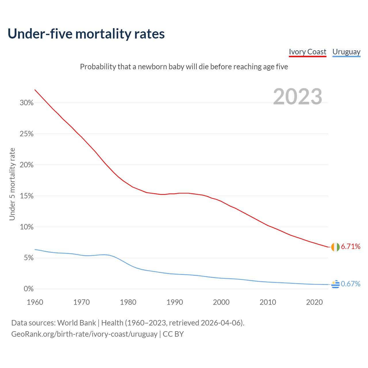 The chance that a newborn baby will die before reaching age five is 6.71% in Ivory Coast and 0.67% in Uruguay. Above is a chart with historical data on under-five mortality rates.