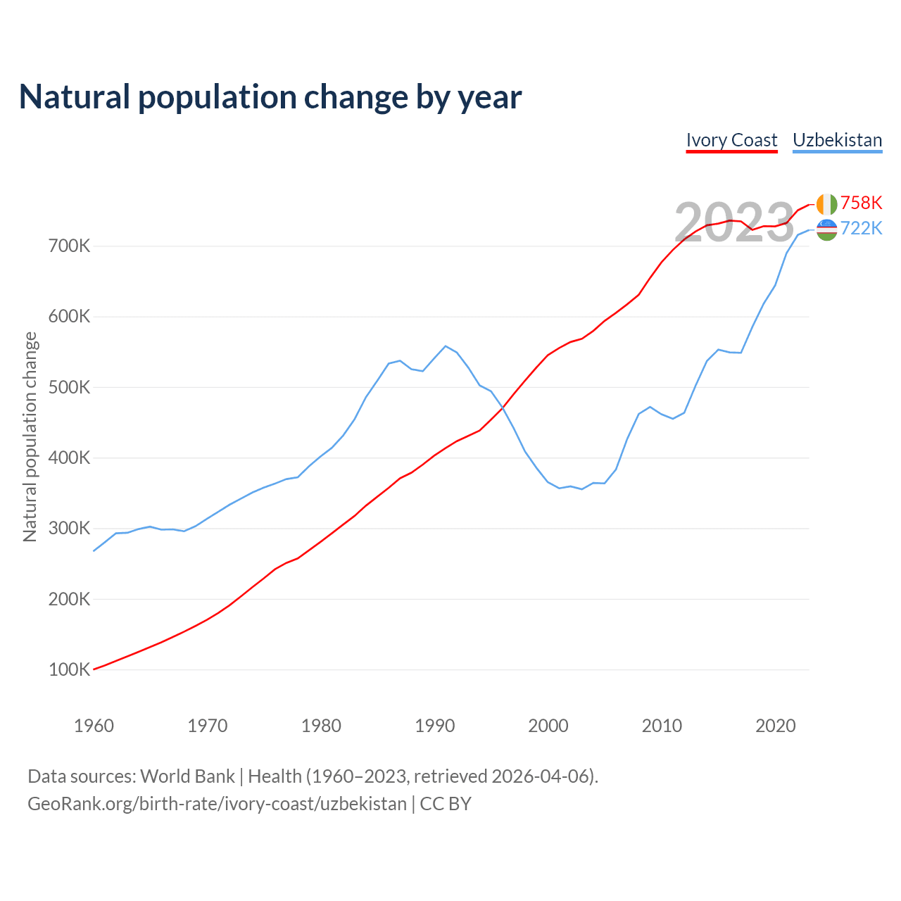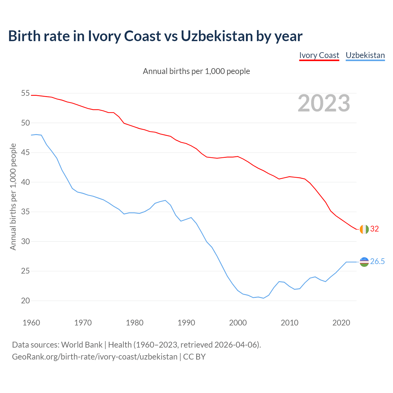 Ivory Coast has an annual birth rate of 32 births per 1,000 people, compared to 26.5 for Uzbekistan. The average number of children a woman is expected to have during her lifetime — the fertility rate, is 4.28 in Ivory Coast and 3.5 in Uzbekistan — 18.3% difference.