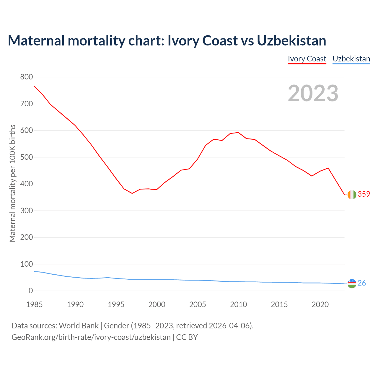 The maternal mortality rate, which is the probability of dying during childbirth or within 42 days of pregnancy termination, is 359 deaths per 100,000 live births in Ivory Coast, compared to 26 deaths in Uzbekistan.
