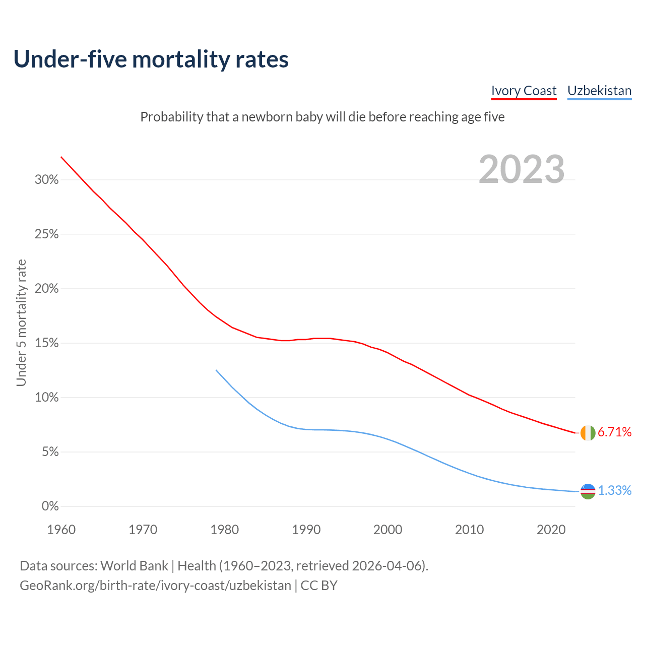 The chance that a newborn baby will die before reaching age five is 6.71% in Ivory Coast and 1.33% in Uzbekistan. Above is a chart with historical data on under-five mortality rates.