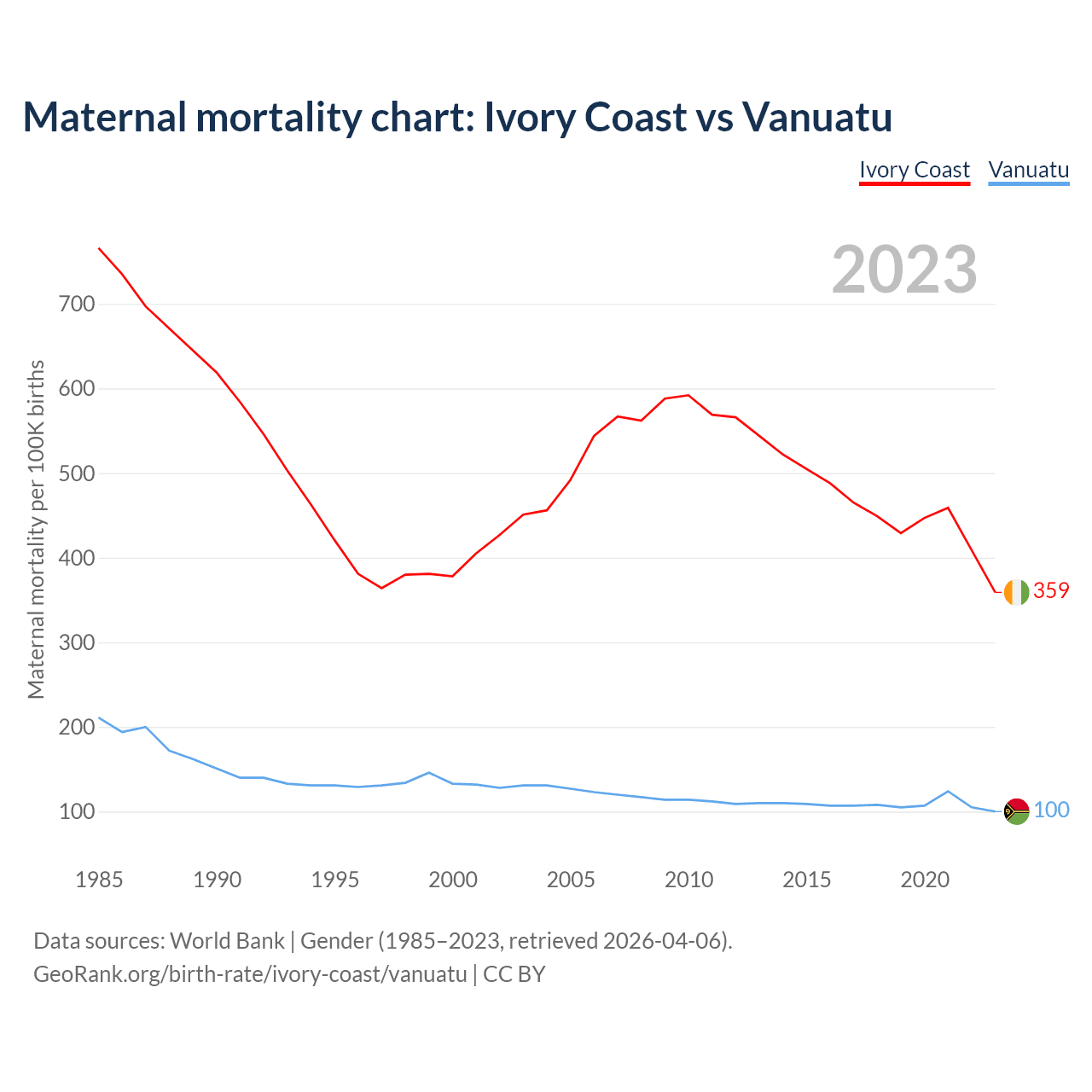 The maternal mortality rate, which is the probability of dying during childbirth or within 42 days of pregnancy termination, is 359 deaths per 100,000 live births in Ivory Coast, compared to 100 deaths in Vanuatu.