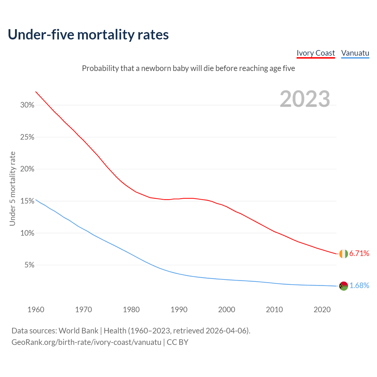 The chance that a newborn baby will die before reaching age five is 6.71% in Ivory Coast and 1.68% in Vanuatu. Above is a chart with historical data on under-five mortality rates.