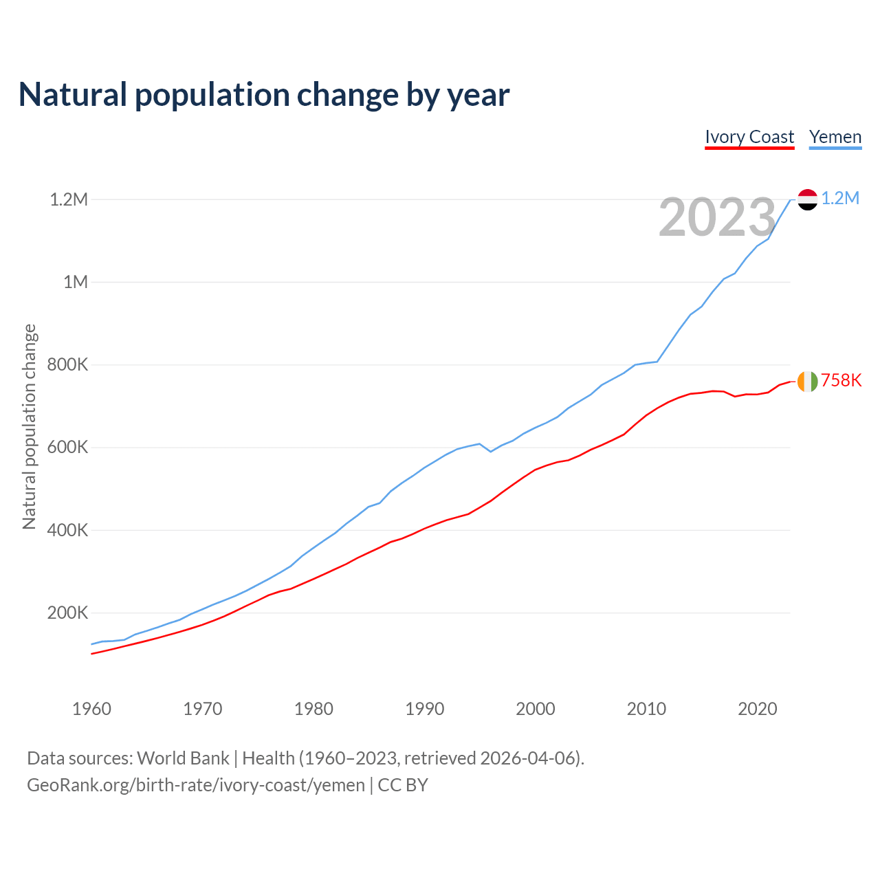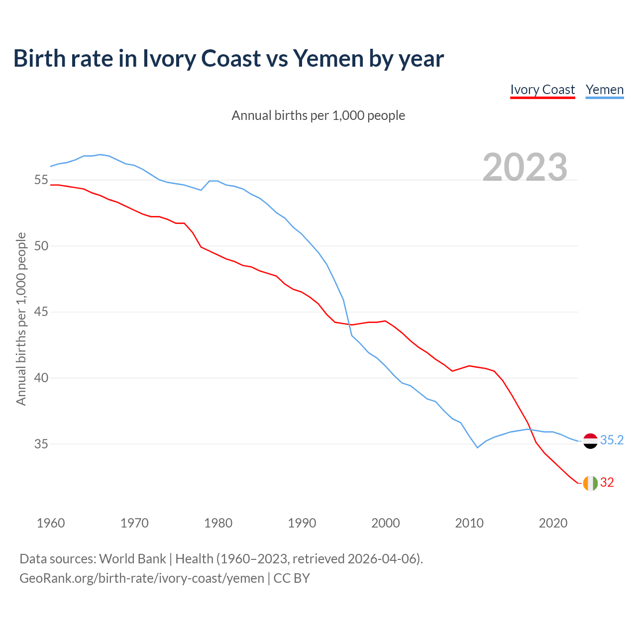 Ivory Coast has an annual birth rate of 32 births per 1,000 people, compared to 35.2 for Yemen. The average number of children a woman is expected to have during her lifetime — the fertility rate, is 4.28 in Ivory Coast and 4.59 in Yemen — 7.17% difference.