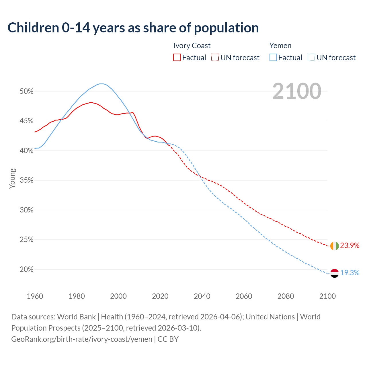 According to the latest available data on birth rates, the fertility rate in Ivory Coast was 4.28 children per woman in 2023, compared to 4.59 in Yemen in 2023. The replacement level is considered to be 2.1 children per woman.