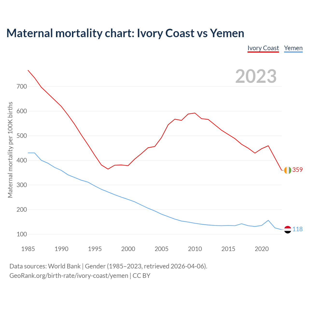 The maternal mortality rate, which is the probability of dying during childbirth or within 42 days of pregnancy termination, is 359 deaths per 100,000 live births in Ivory Coast, compared to 118 deaths in Yemen.