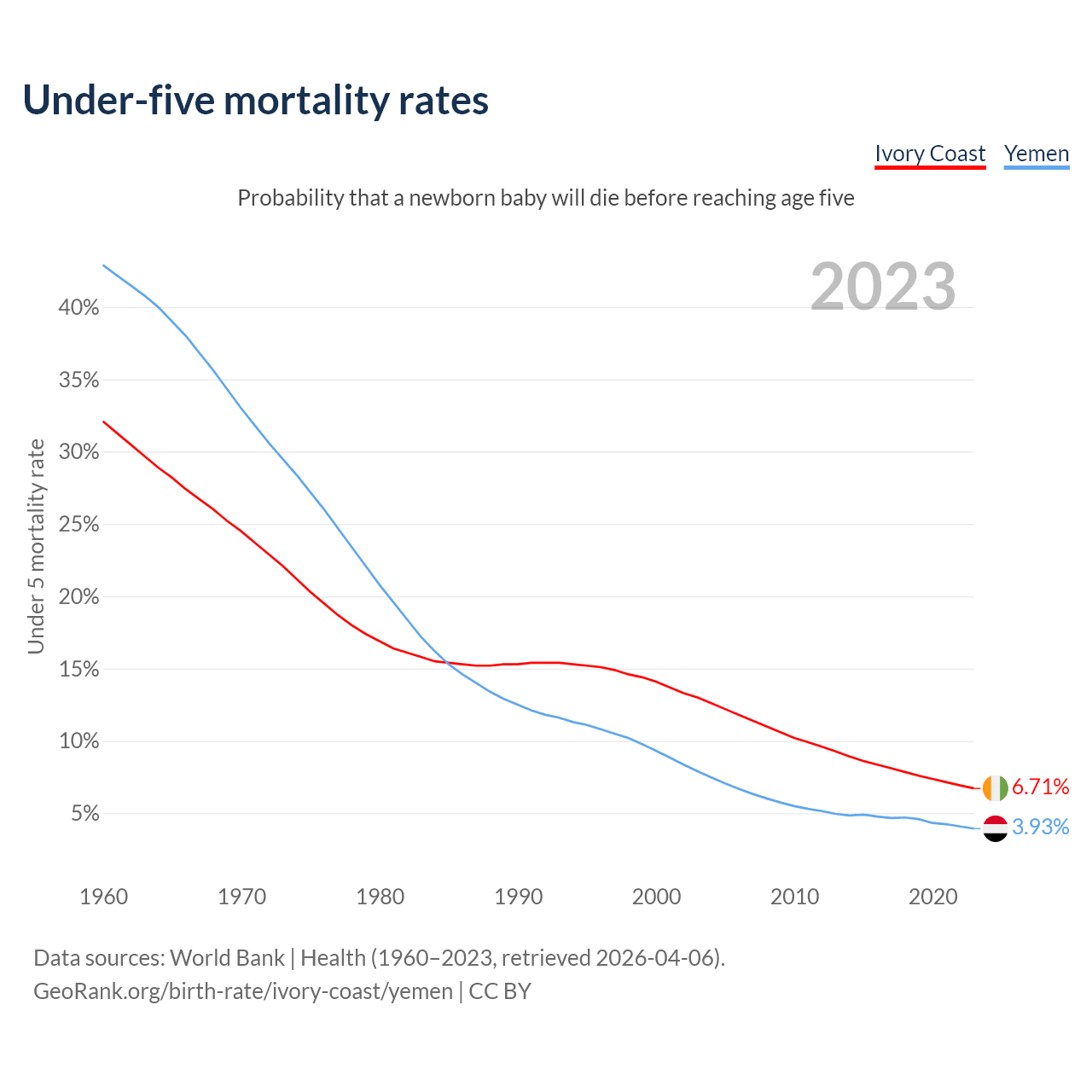 The chance that a newborn baby will die before reaching age five is 6.71% in Ivory Coast and 3.93% in Yemen. Above is a chart with historical data on under-five mortality rates.