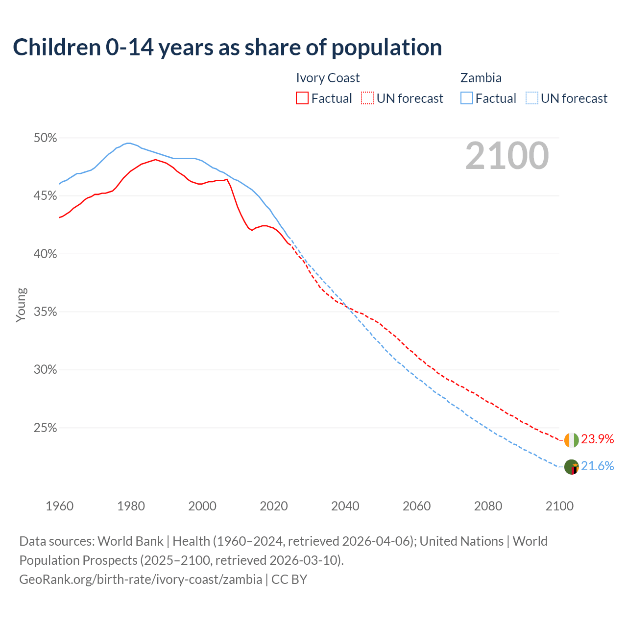 1960 vs 2023, the fertility rate has decreased by 44.3% in Ivory Coast and by 41% in Zambia — in 1960, it was 7.69 and 6.95, respectively.