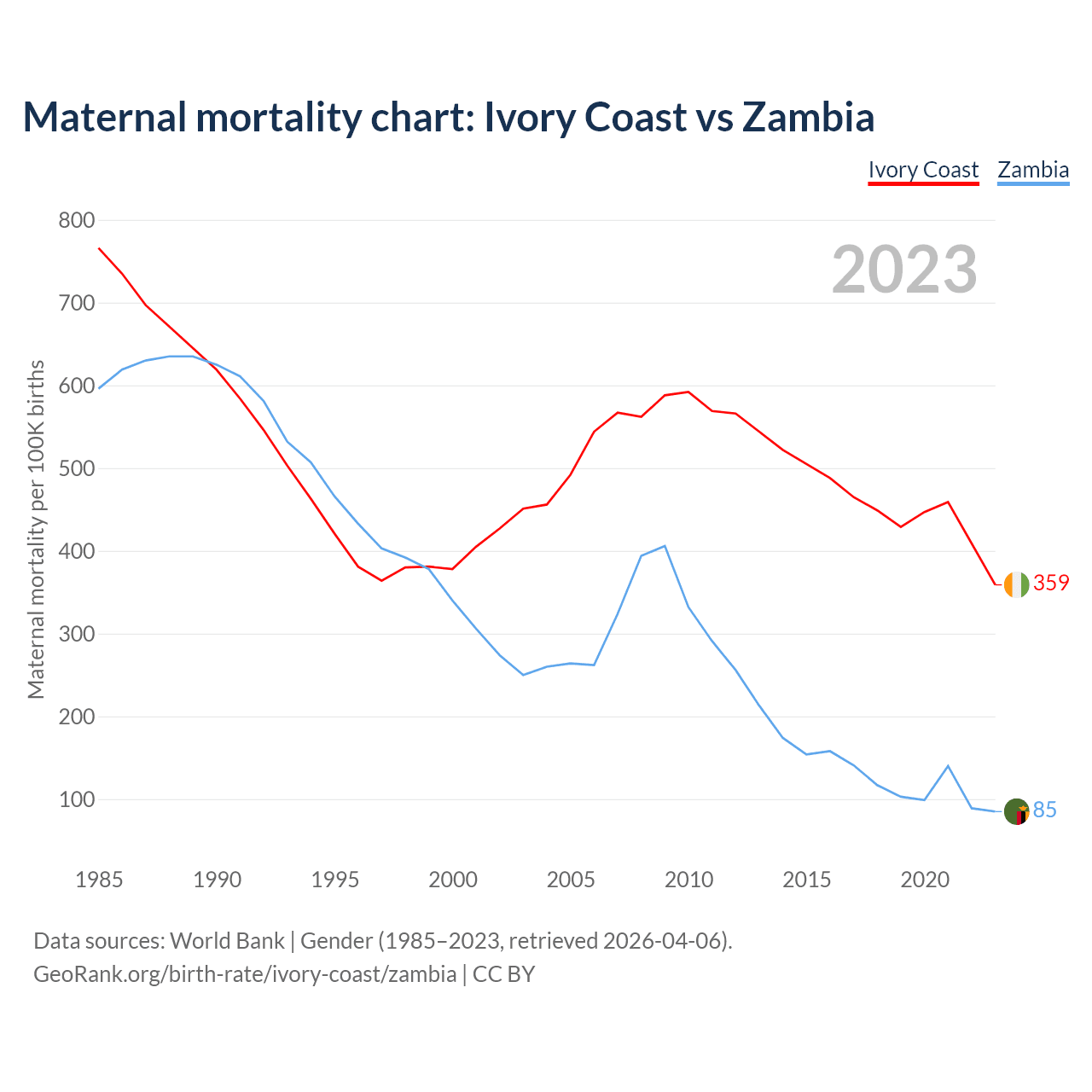 The maternal mortality rate, which is the probability of dying during childbirth or within 42 days of pregnancy termination, is 359 deaths per 100,000 live births in Ivory Coast, compared to 85 deaths in Zambia.