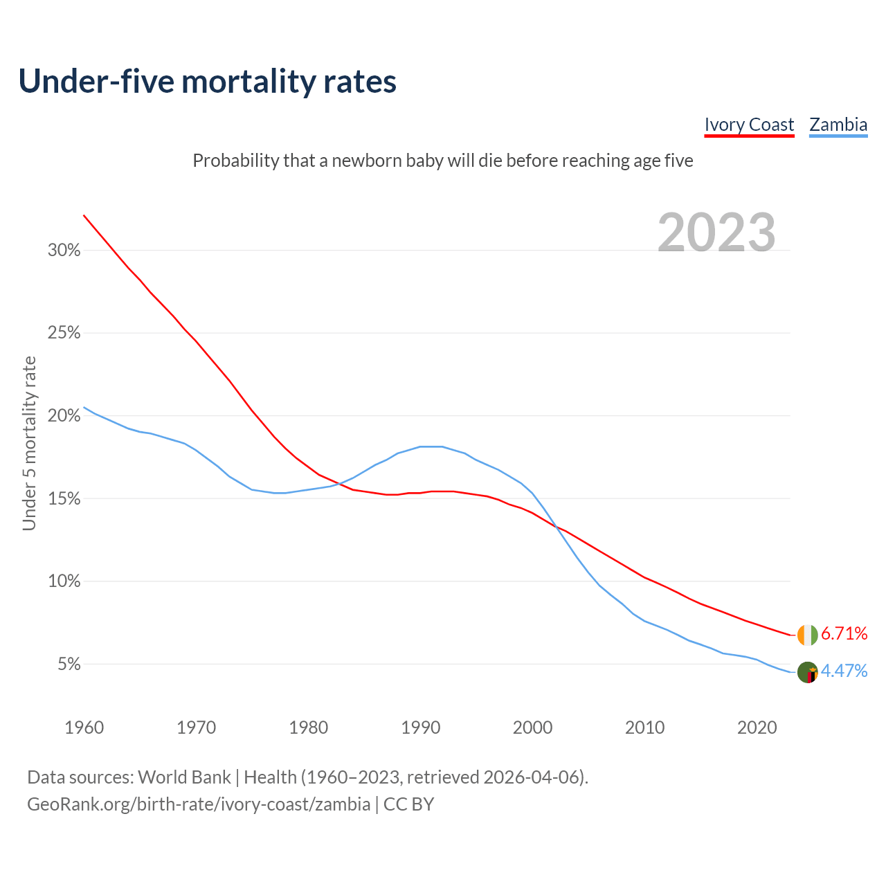 The chance that a newborn baby will die before reaching age five is 6.71% in Ivory Coast and 4.47% in Zambia. Above is a chart with historical data on under-five mortality rates.