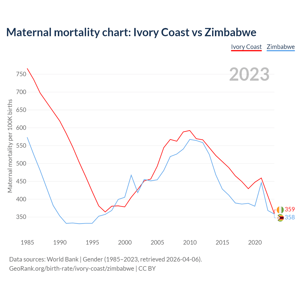 The maternal mortality rate, which is the probability of dying during childbirth or within 42 days of pregnancy termination, is 359 deaths per 100,000 live births in Ivory Coast, compared to 358 deaths in Zimbabwe.