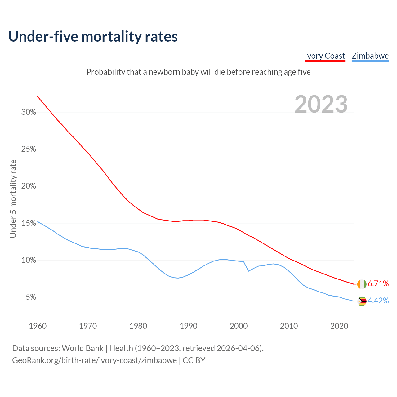 The chance that a newborn baby will die before reaching age five is 6.71% in Ivory Coast and 4.42% in Zimbabwe. Above is a chart with historical data on under-five mortality rates.