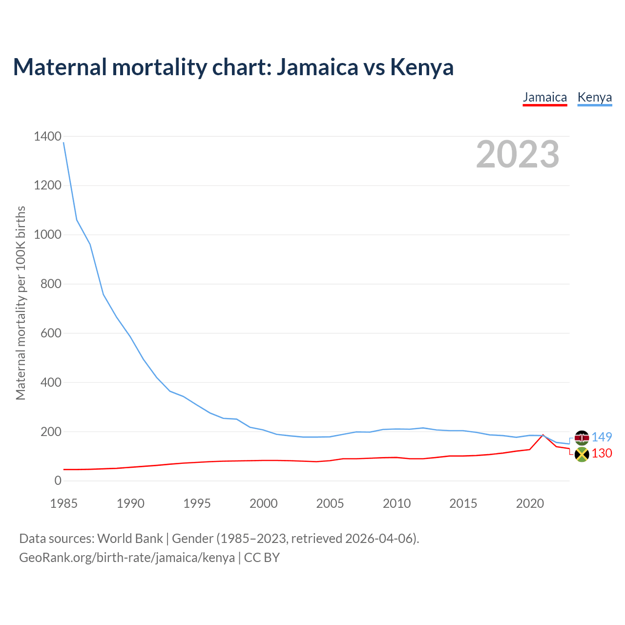 The maternal mortality rate, which is the probability of dying during childbirth or within 42 days of pregnancy termination, is 130 deaths per 100,000 live births in Jamaica, compared to 149 deaths in Kenya.