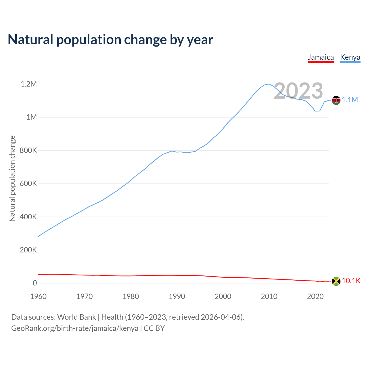 Jamaica has an annual birth rate of 11.6 births per 1,000 people, compared to 27.1 for Kenya. The average number of children a woman is expected to have during her lifetime — the fertility rate, is 1.36 in Jamaica and 3.21 in Kenya — 136.2% difference.