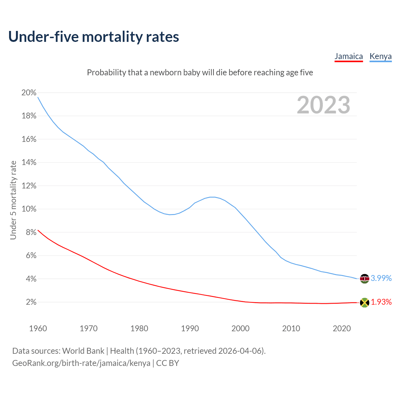 The chance that a newborn baby will die before reaching age five is 1.93% in Jamaica and 3.99% in Kenya. Above is a chart with historical data on under-five mortality rates.