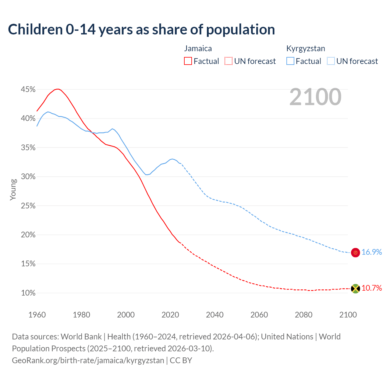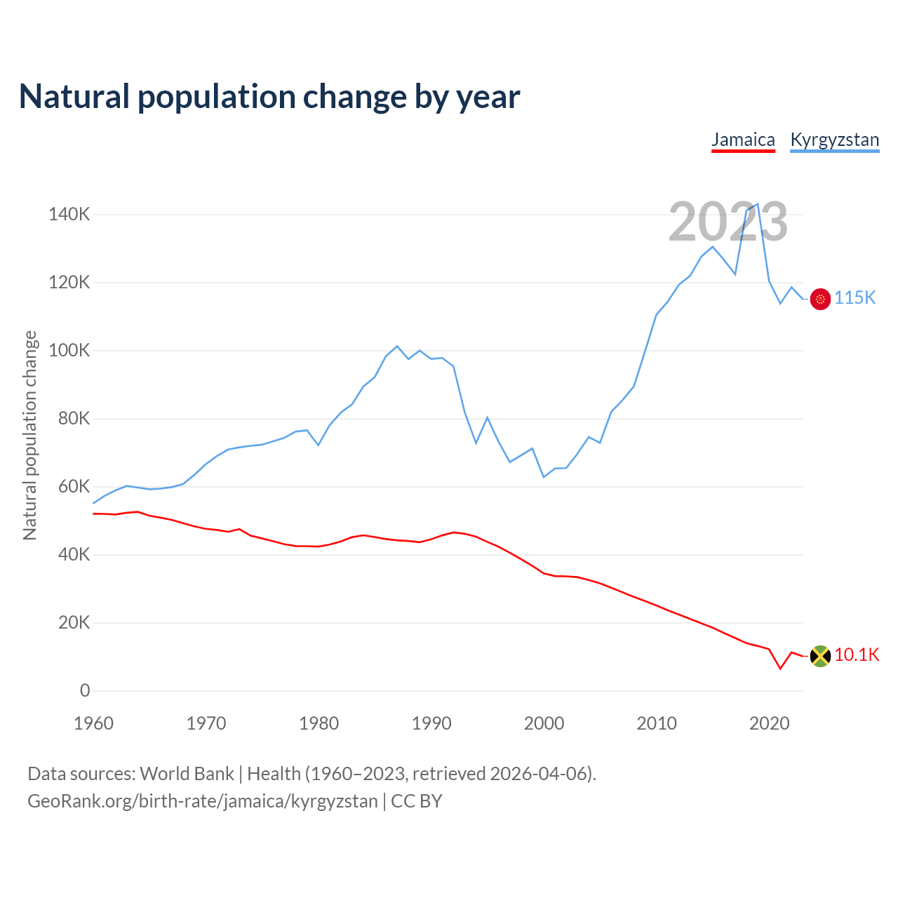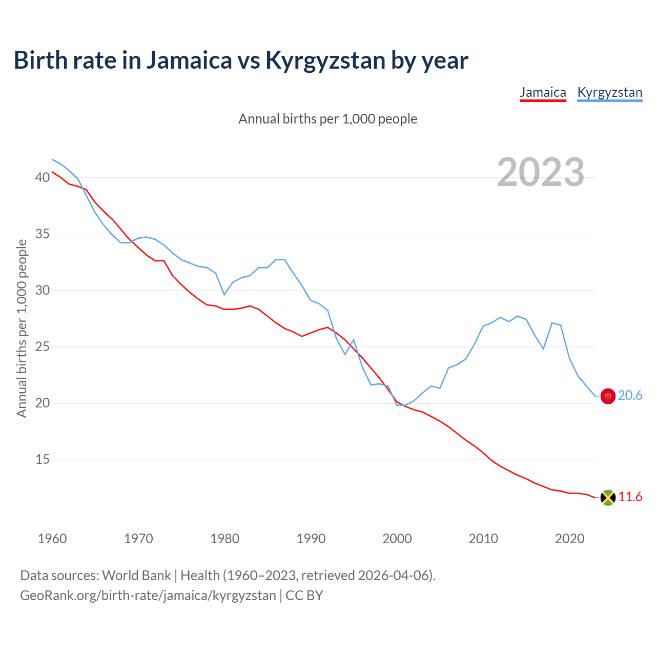 Jamaica has an annual birth rate of 11.6 births per 1,000 people, compared to 20.6 for Kyrgyzstan. The average number of children a woman is expected to have during her lifetime — the fertility rate, is 1.36 in Jamaica and 2.7 in Kyrgyzstan — 98.8% difference.
