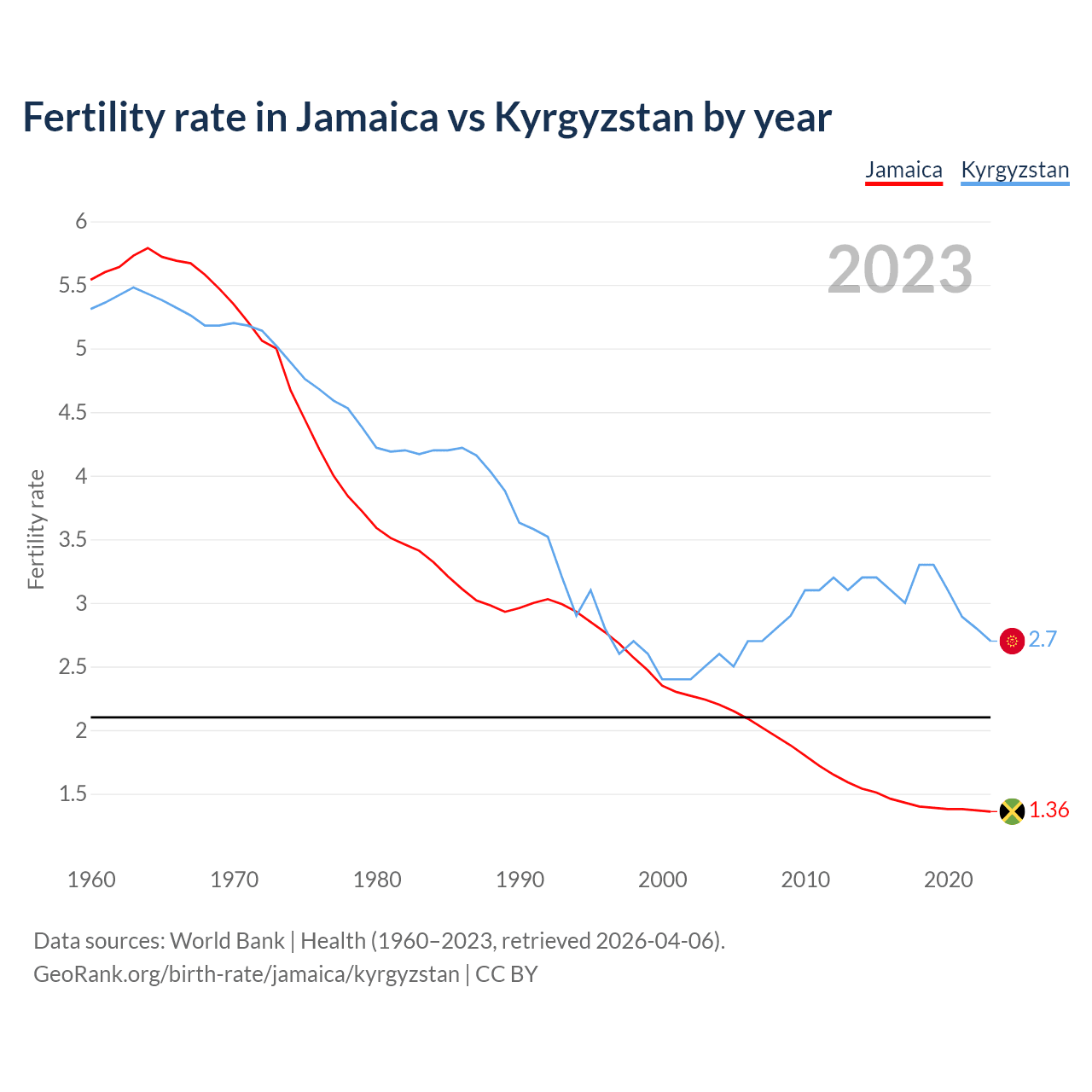 According to the latest available data on birth rates, the fertility rate in Jamaica was 1.36 children per woman in 2023, compared to 2.7 in Kyrgyzstan in 2023. The replacement level is considered to be 2.1 children per woman.