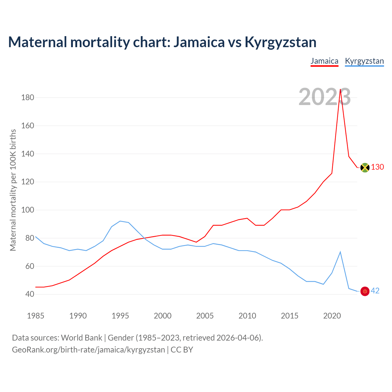 The maternal mortality rate, which is the probability of dying during childbirth or within 42 days of pregnancy termination, is 130 deaths per 100,000 live births in Jamaica, compared to 42 deaths in Kyrgyzstan.