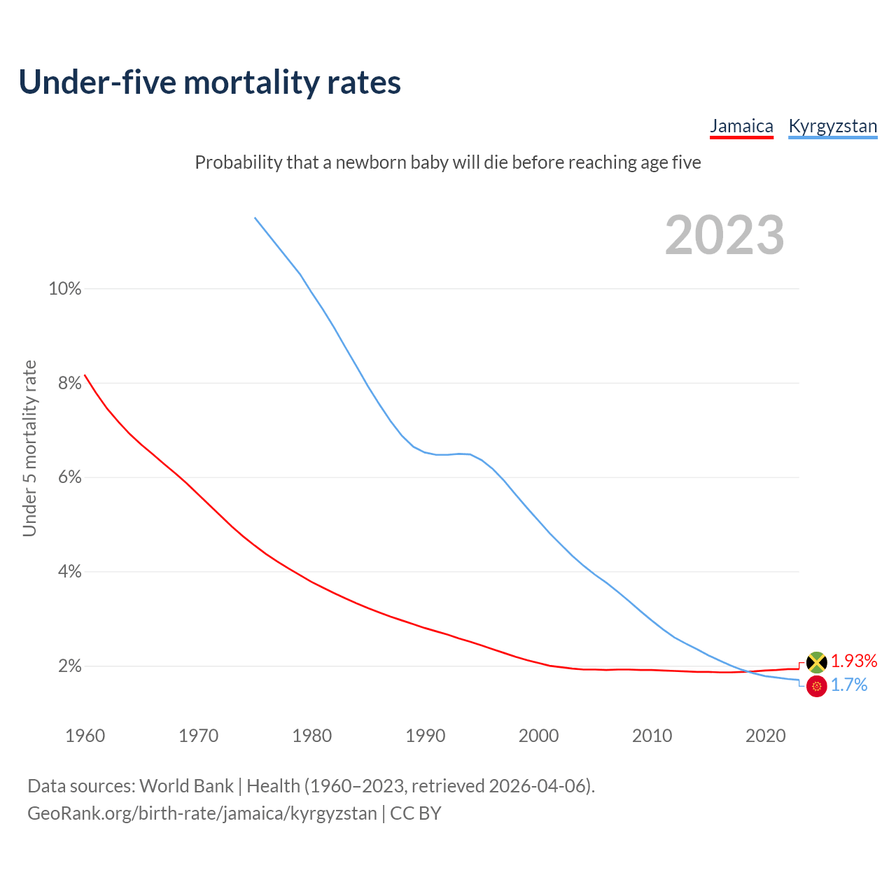 The chance that a newborn baby will die before reaching age five is 1.93% in Jamaica and 1.7% in Kyrgyzstan. Above is a chart with historical data on under-five mortality rates.