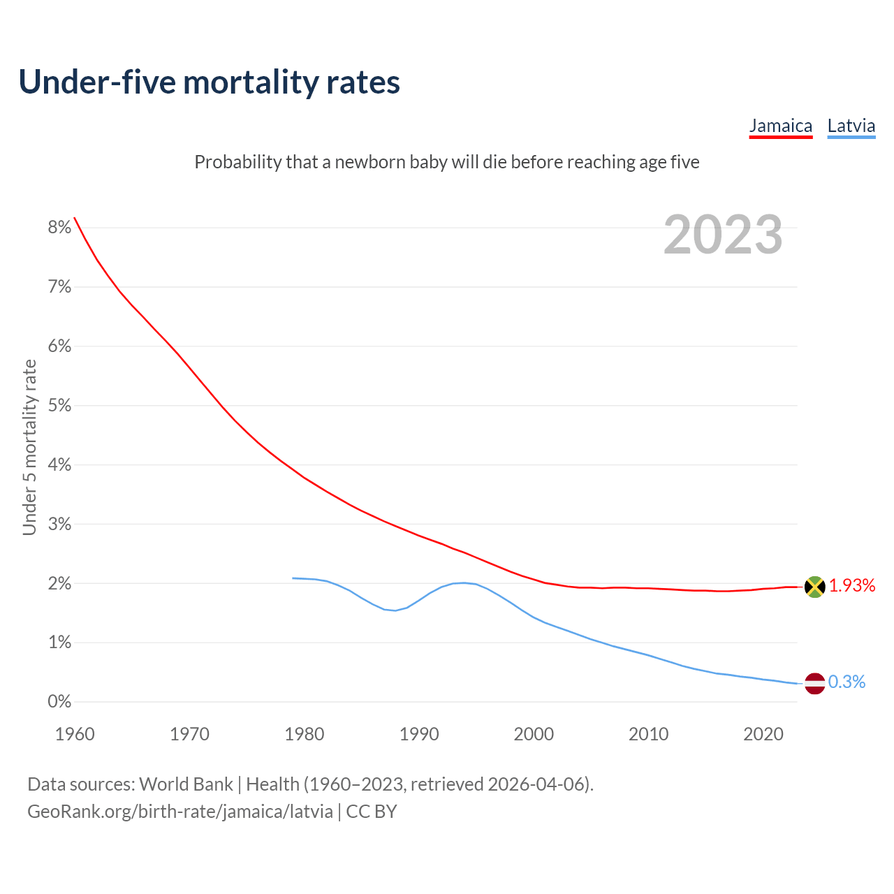 The chance that a newborn baby will die before reaching age five is 1.93% in Jamaica and 0.3% in Latvia. Above is a chart with historical data on under-five mortality rates.