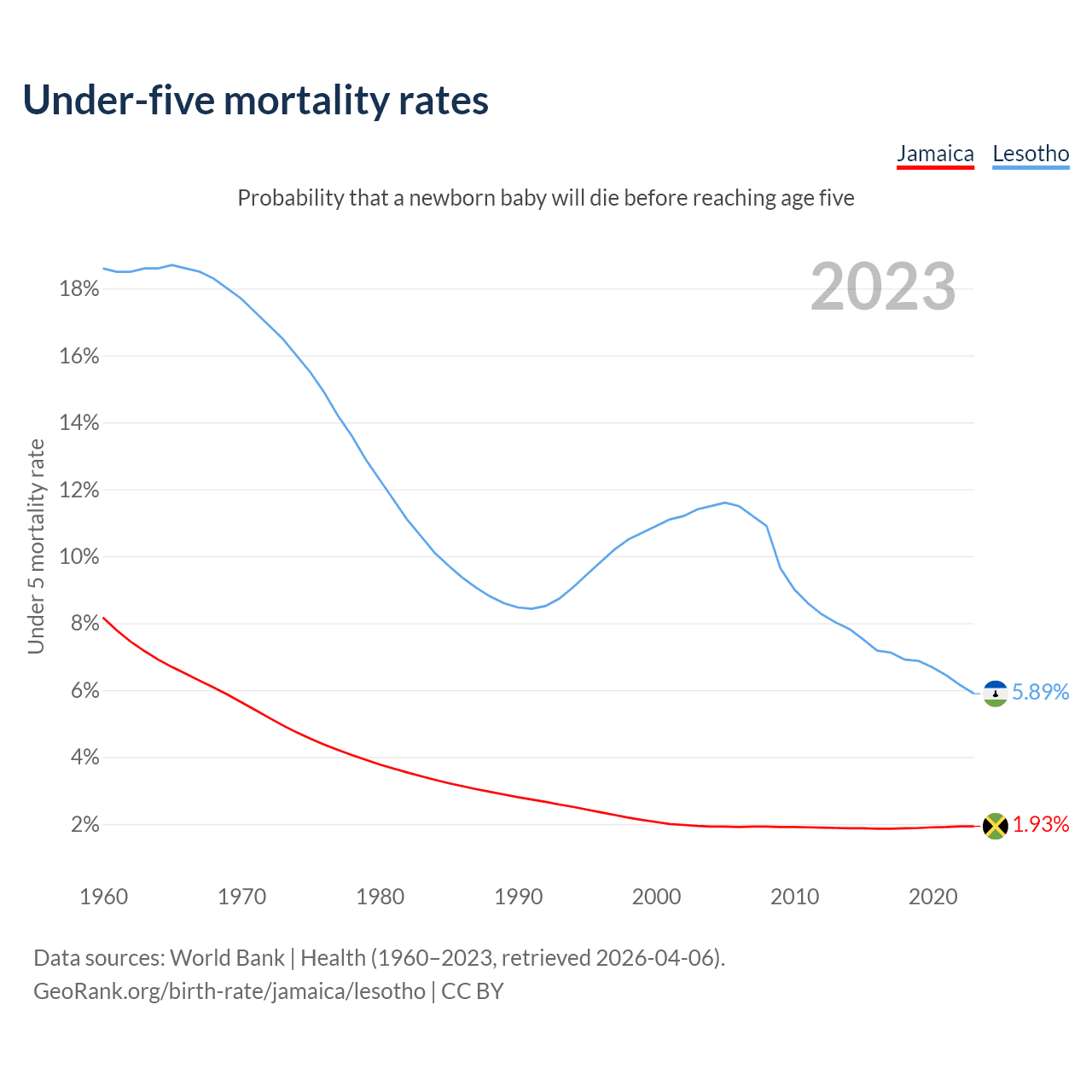 The chance that a newborn baby will die before reaching age five is 1.93% in Jamaica and 5.89% in Lesotho. Above is a chart with historical data on under-five mortality rates.
