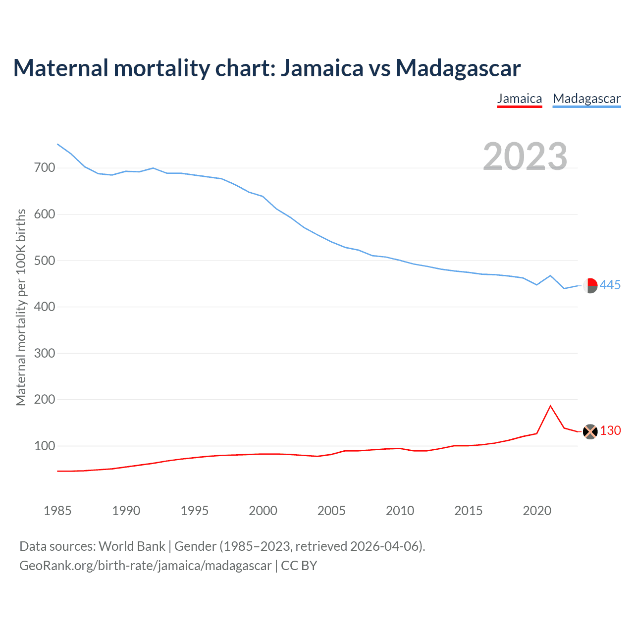 Data sources: World Bank | Gender (1985–2023, retrieved 2026-04-06).