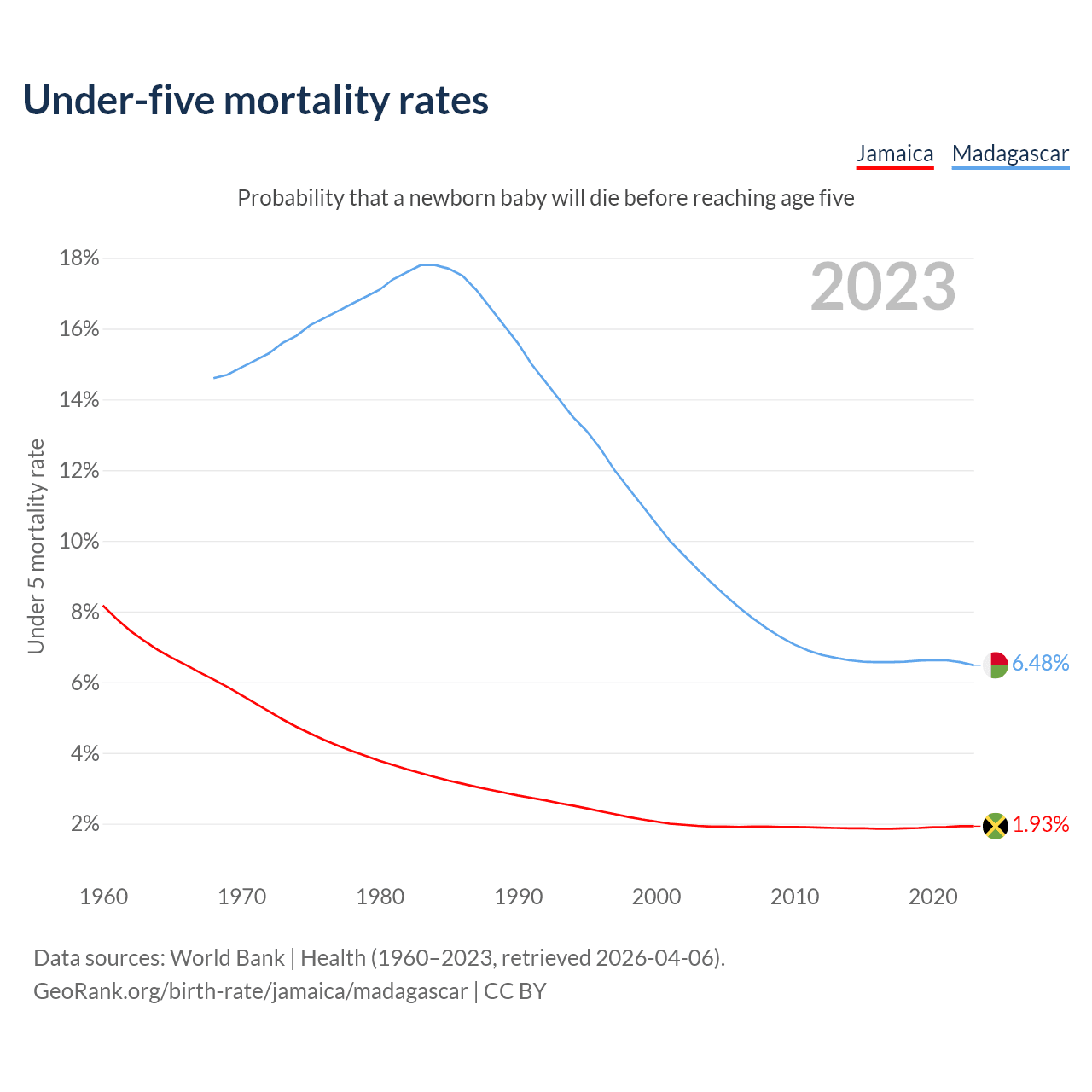 The chance that a newborn baby will die before reaching age five is 1.93% in Jamaica and 6.48% in Madagascar. Above is a chart with historical data on under-five mortality rates.