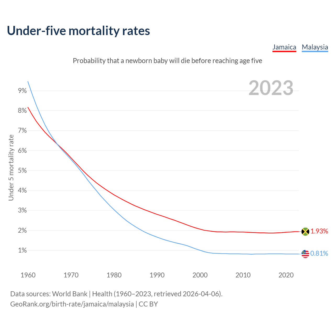 The chance that a newborn baby will die before reaching age five is 1.93% in Jamaica and 0.81% in Malaysia. Above is a chart with historical data on under-five mortality rates.
