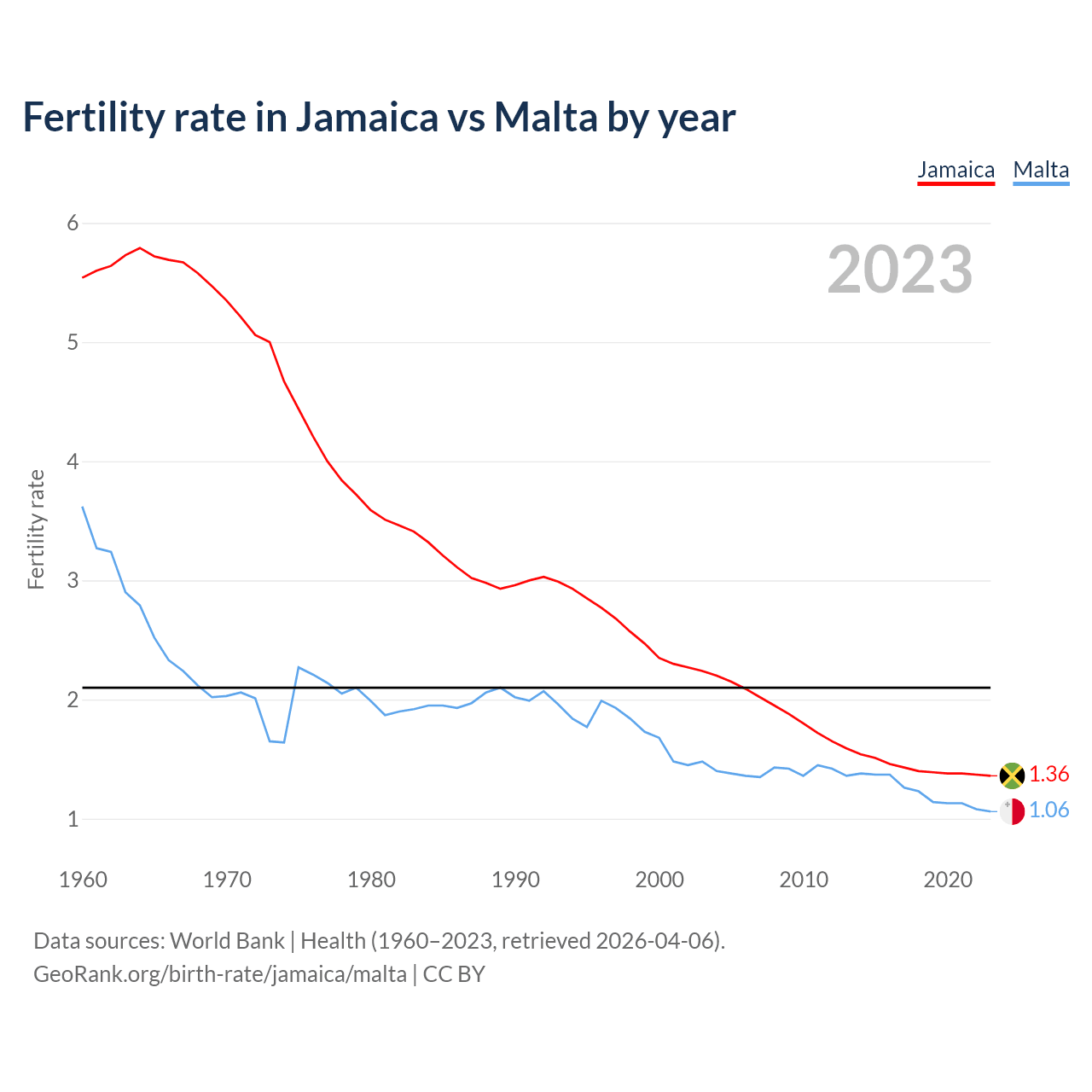 1960 vs 2023, the fertility rate has decreased by 75.5% in Jamaica and by 70.7% in Malta — in 1960, it was 5.54 and 3.62, respectively.
