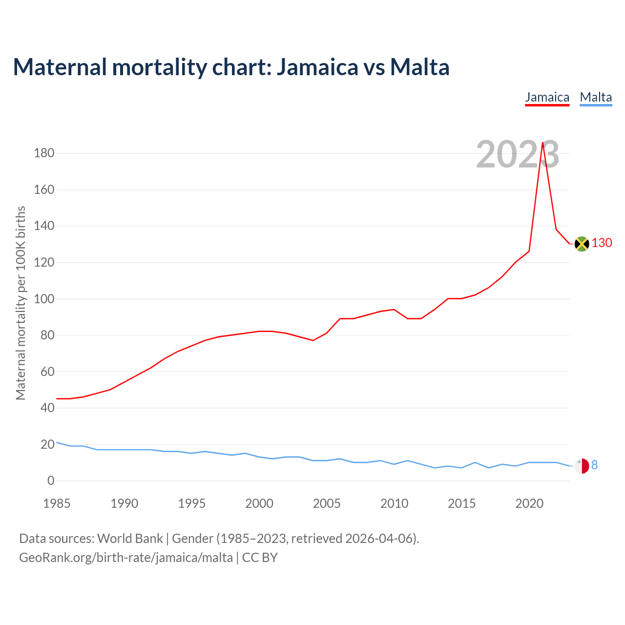 The maternal mortality rate, which is the probability of dying during childbirth or within 42 days of pregnancy termination, is 130 deaths per 100,000 live births in Jamaica, compared to 8 deaths in Malta.