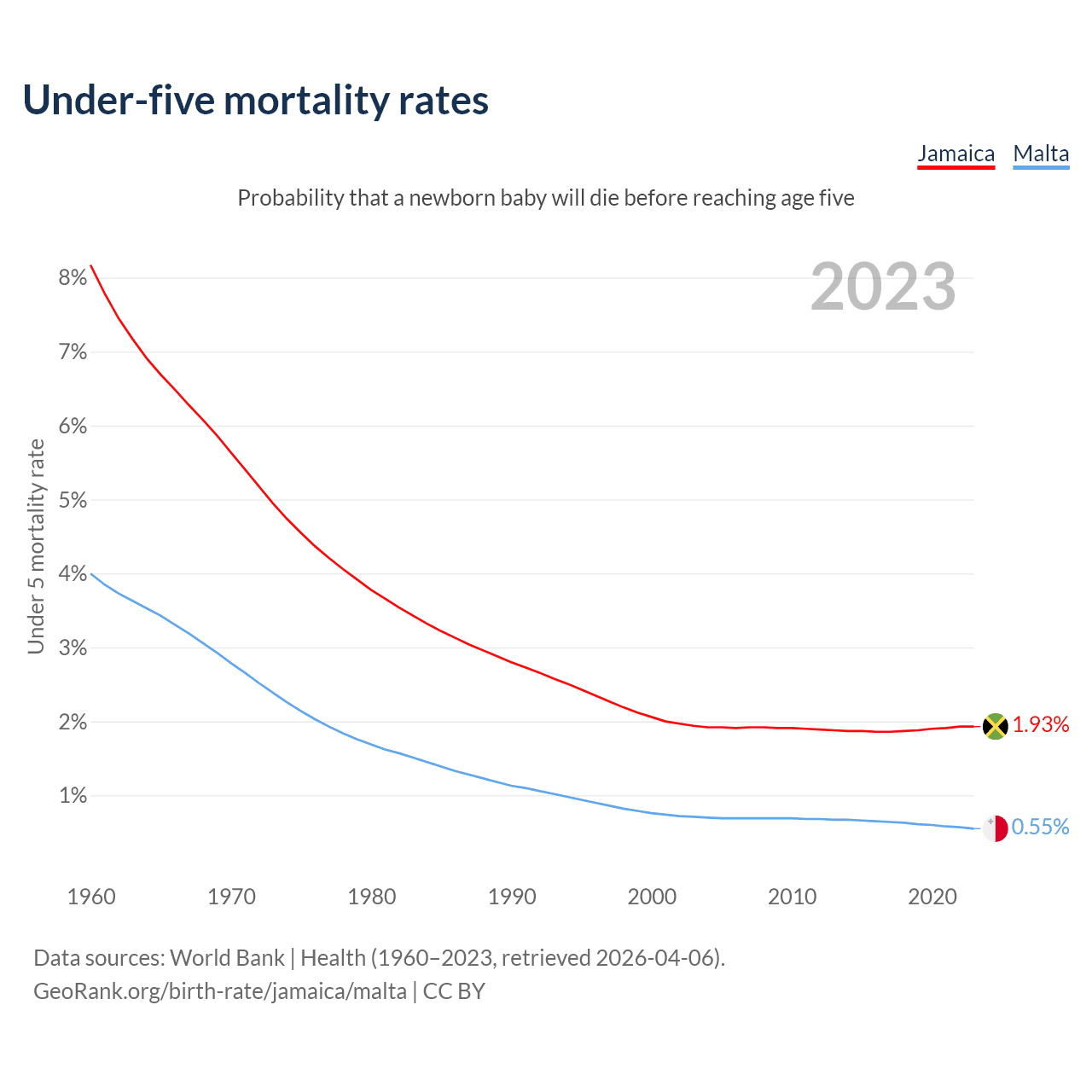 The chance that a newborn baby will die before reaching age five is 1.93% in Jamaica and 0.55% in Malta. Above is a chart with historical data on under-five mortality rates.