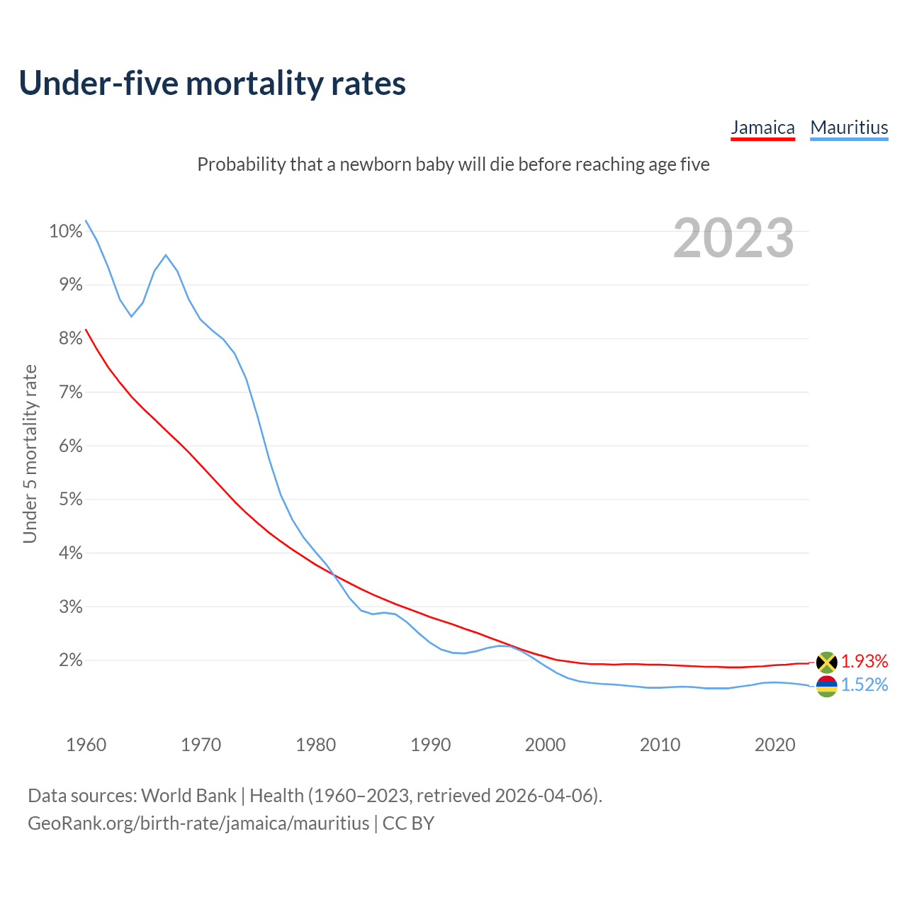 The chance that a newborn baby will die before reaching age five is 1.93% in Jamaica and 1.52% in Mauritius. Above is a chart with historical data on under-five mortality rates.