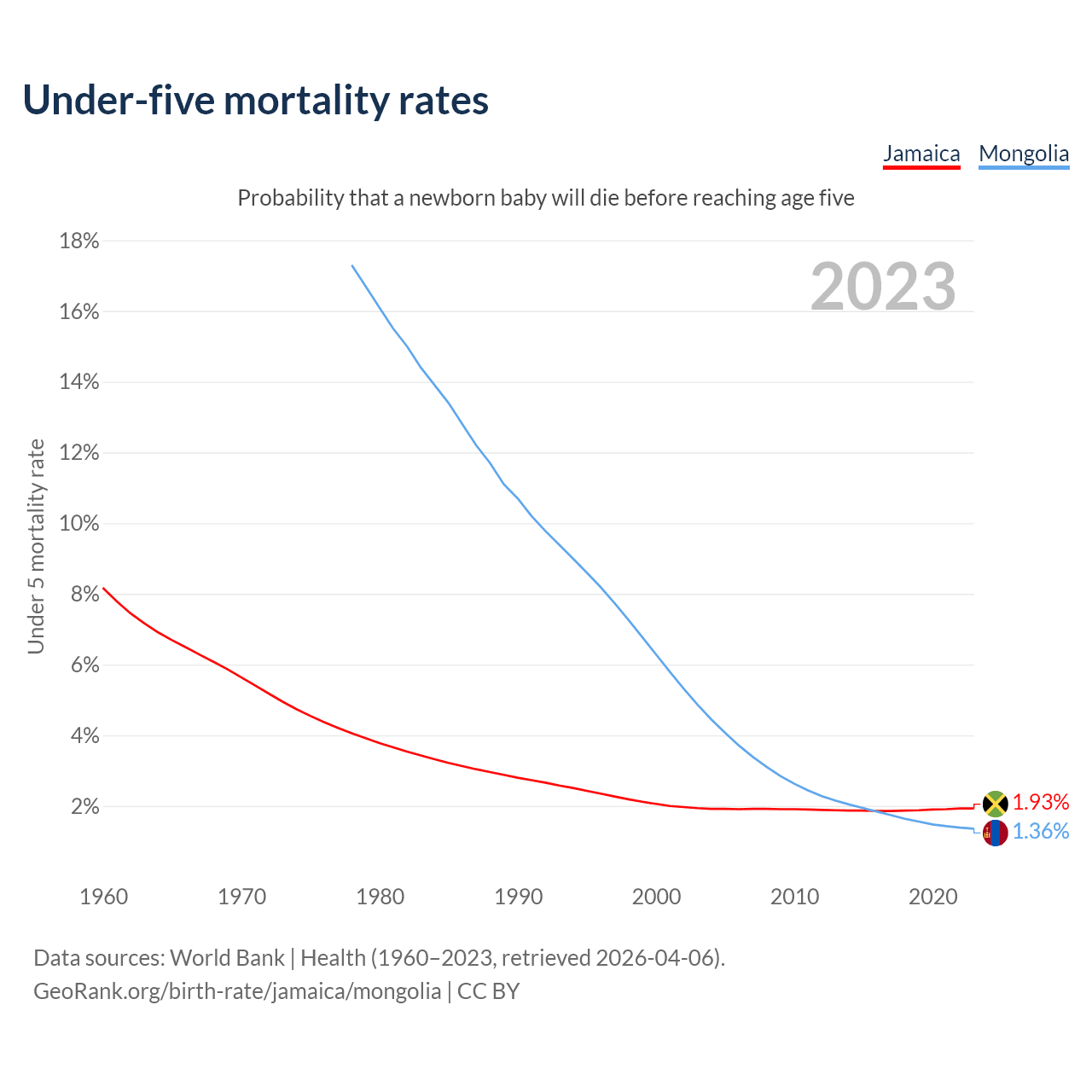 The chance that a newborn baby will die before reaching age five is 1.93% in Jamaica and 1.36% in Mongolia. Above is a chart with historical data on under-five mortality rates.