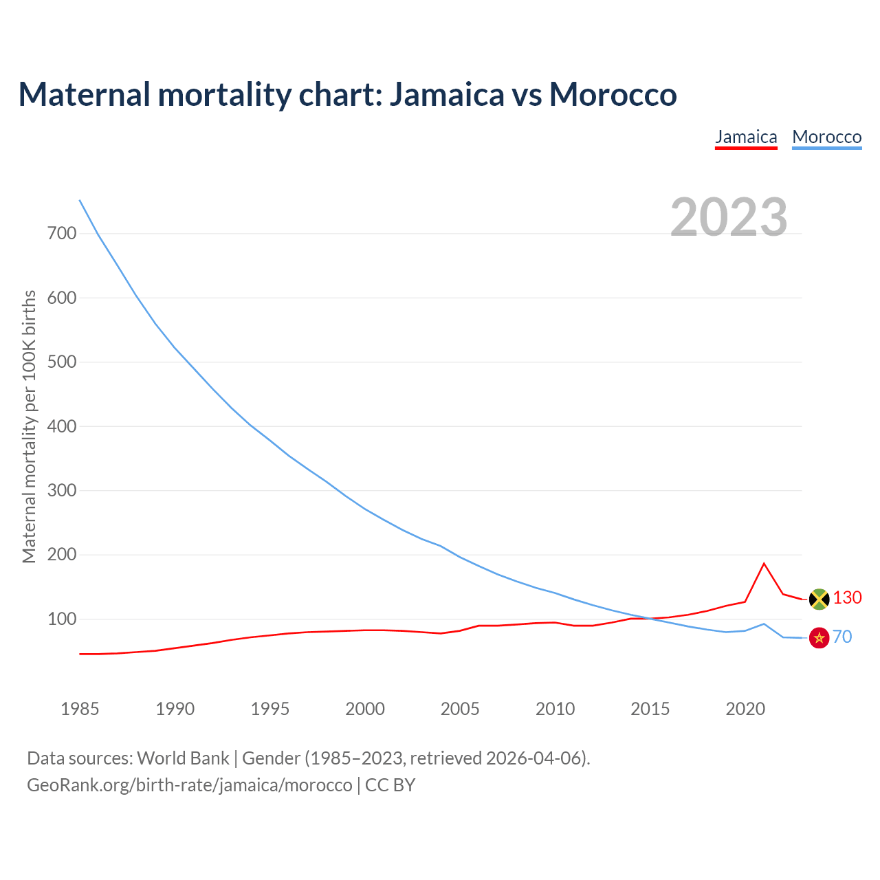 The maternal mortality rate, which is the probability of dying during childbirth or within 42 days of pregnancy termination, is 130 deaths per 100,000 live births in Jamaica, compared to 70 deaths in Morocco.