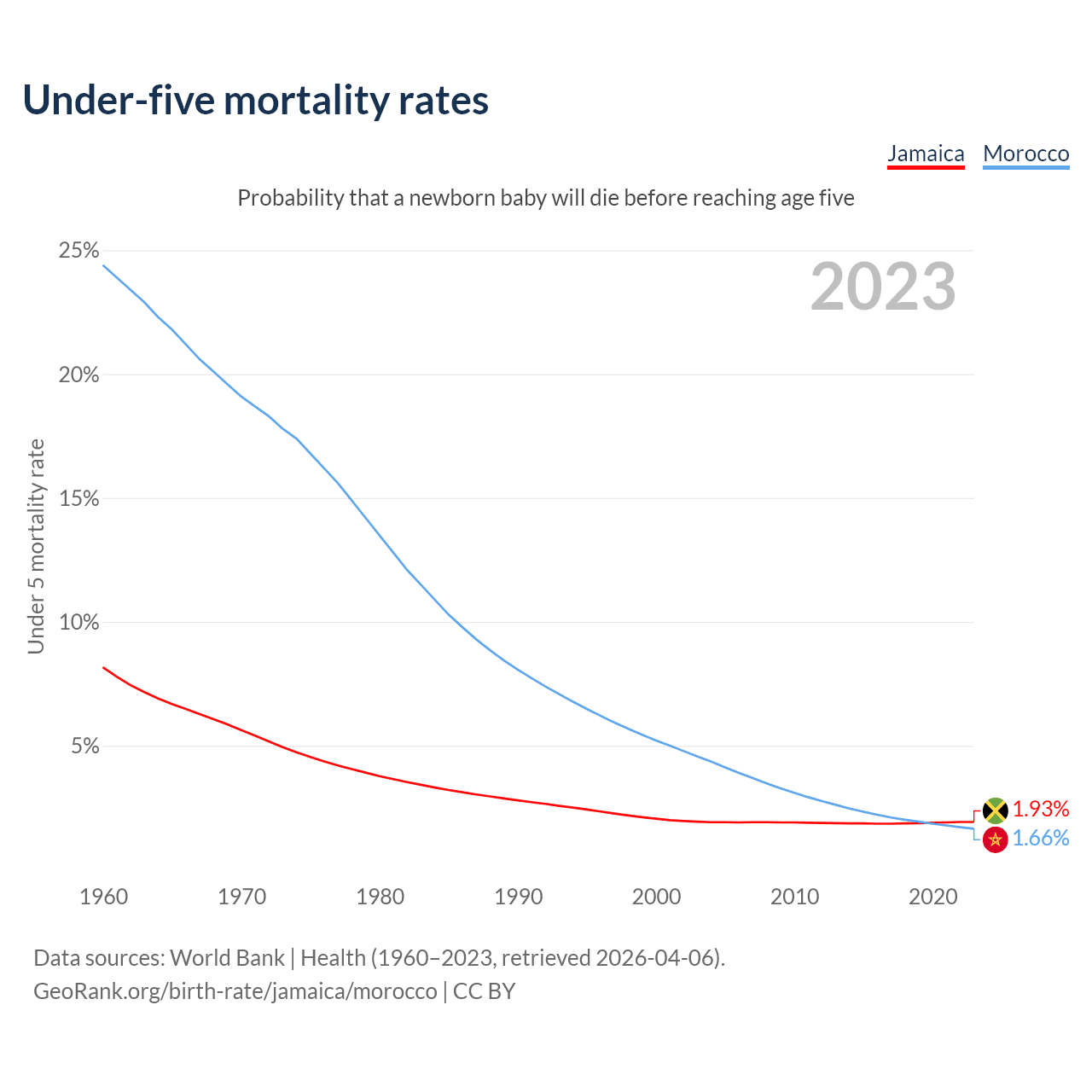 The chance that a newborn baby will die before reaching age five is 1.93% in Jamaica and 1.66% in Morocco. Above is a chart with historical data on under-five mortality rates.