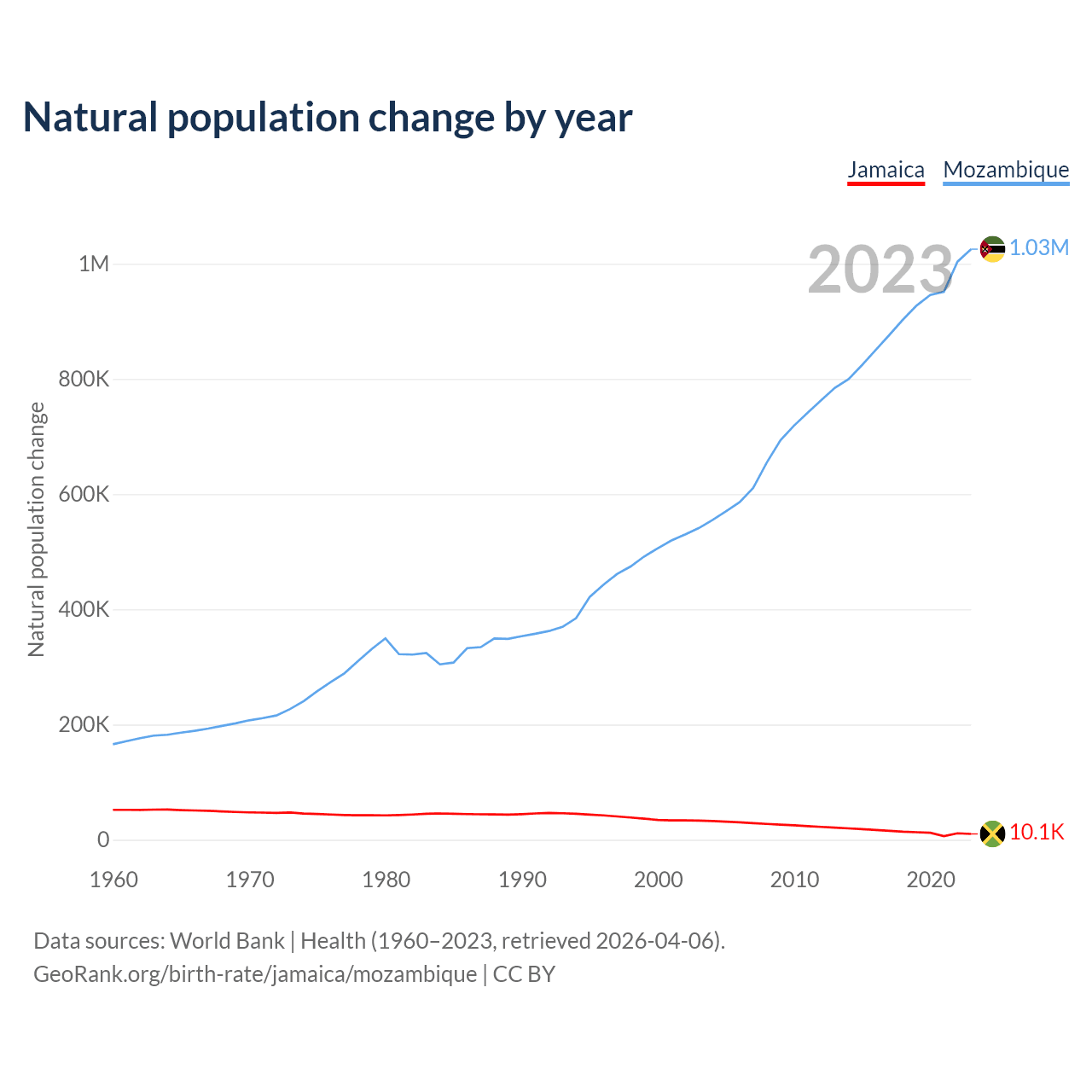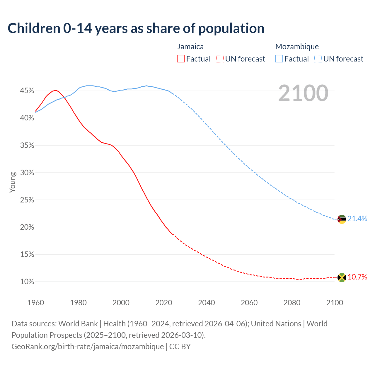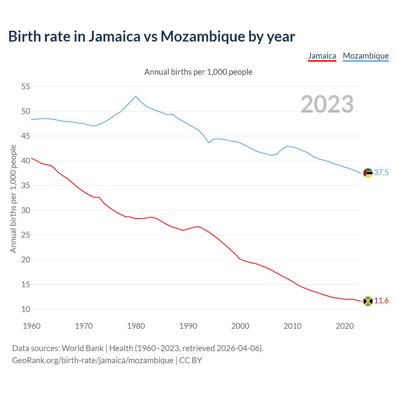 Jamaica has an annual birth rate of 11.6 births per 1,000 people, compared to 37.5 for Mozambique. The average number of children a woman is expected to have during her lifetime — the fertility rate, is 1.36 in Jamaica and 4.76 in Mozambique — 250.7% difference.