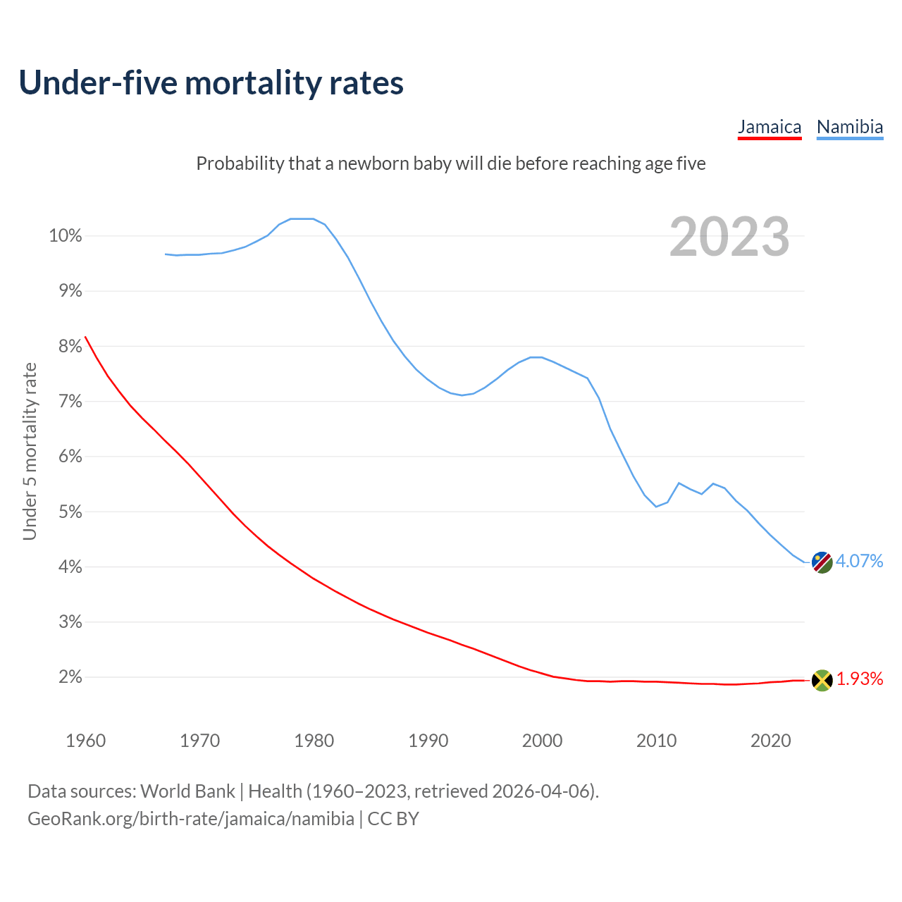 The chance that a newborn baby will die before reaching age five is 1.93% in Jamaica and 4.07% in Namibia. Above is a chart with historical data on under-five mortality rates.