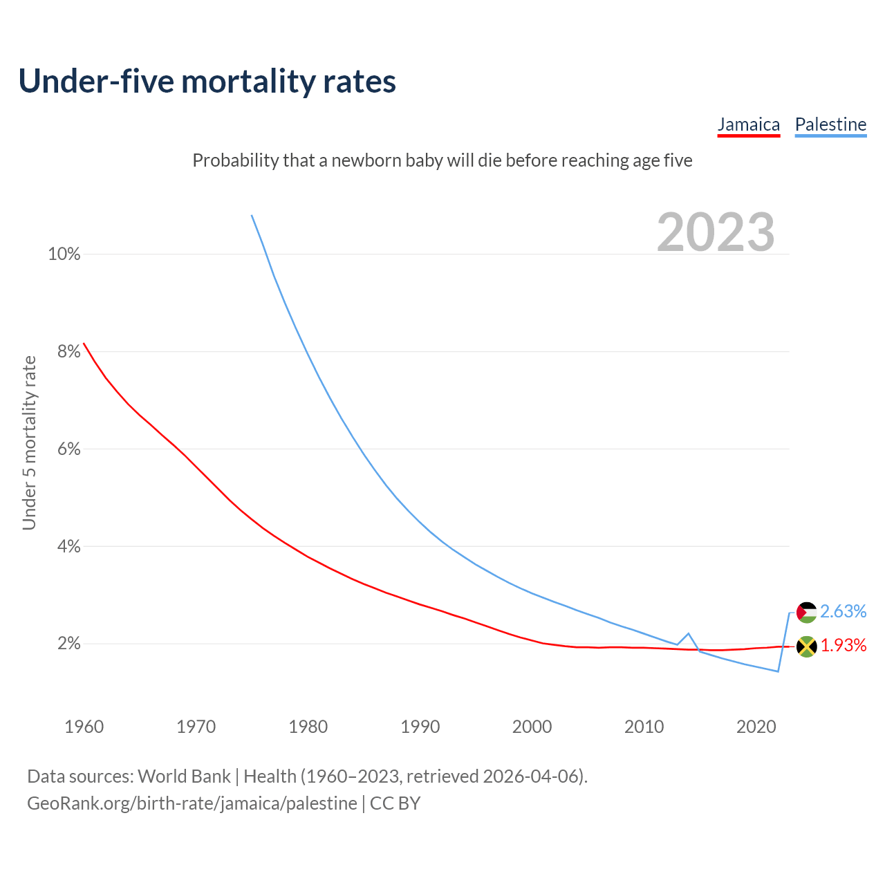 The chance that a newborn baby will die before reaching age five is 1.93% in Jamaica and 2.63% in Palestine. Above is a chart with historical data on under-five mortality rates.