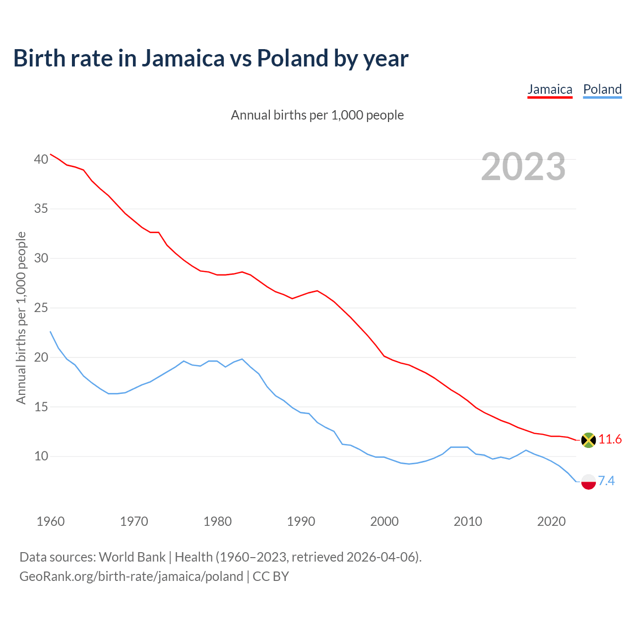 Jamaica has an annual birth rate of 11.6 births per 1,000 people, compared to 7.4 for Poland. The average number of children a woman is expected to have during her lifetime — the fertility rate, is 1.36 in Jamaica and 1.16 in Poland — 14.7% difference.