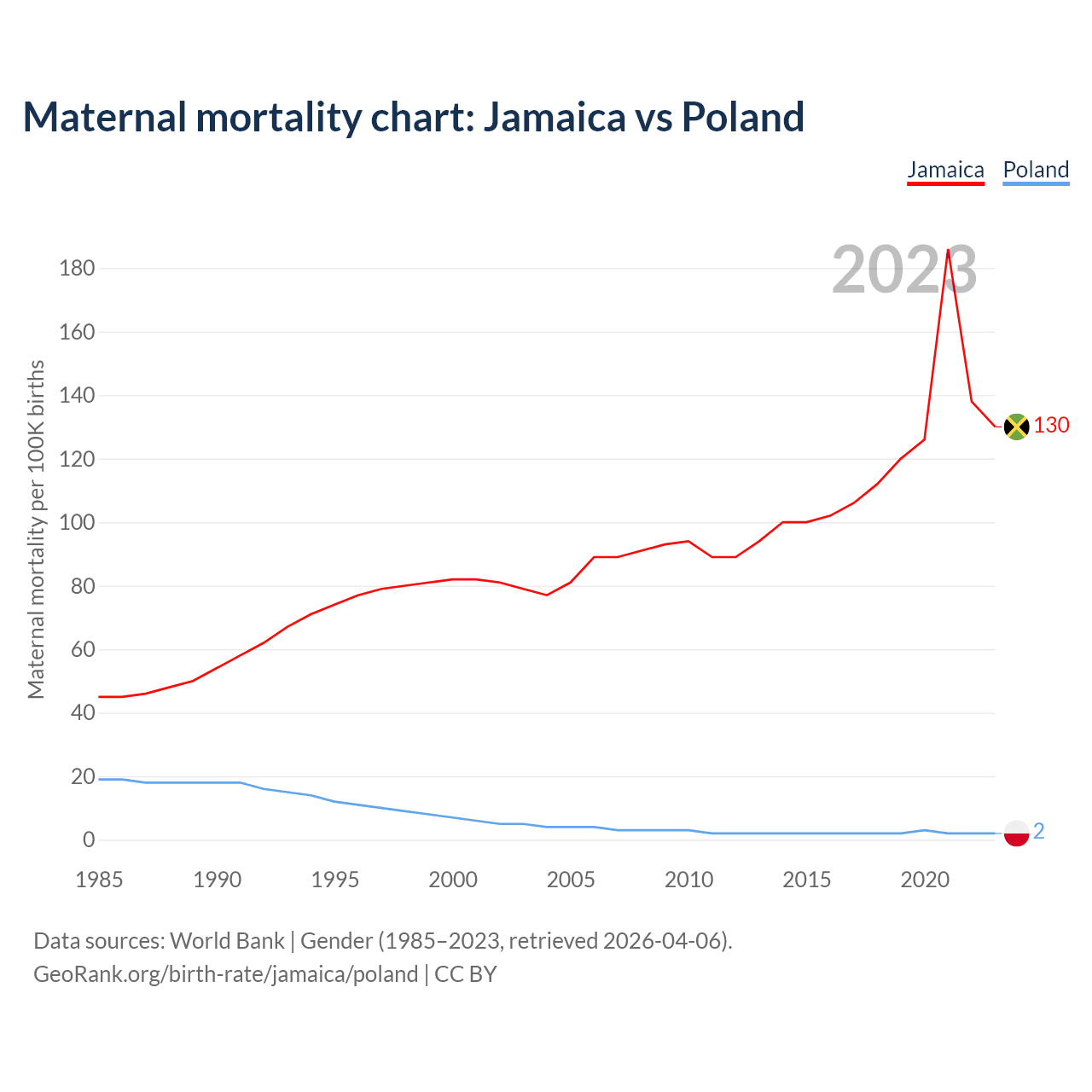 The maternal mortality rate, which is the probability of dying during childbirth or within 42 days of pregnancy termination, is 130 deaths per 100,000 live births in Jamaica, compared to 2 deaths in Poland.