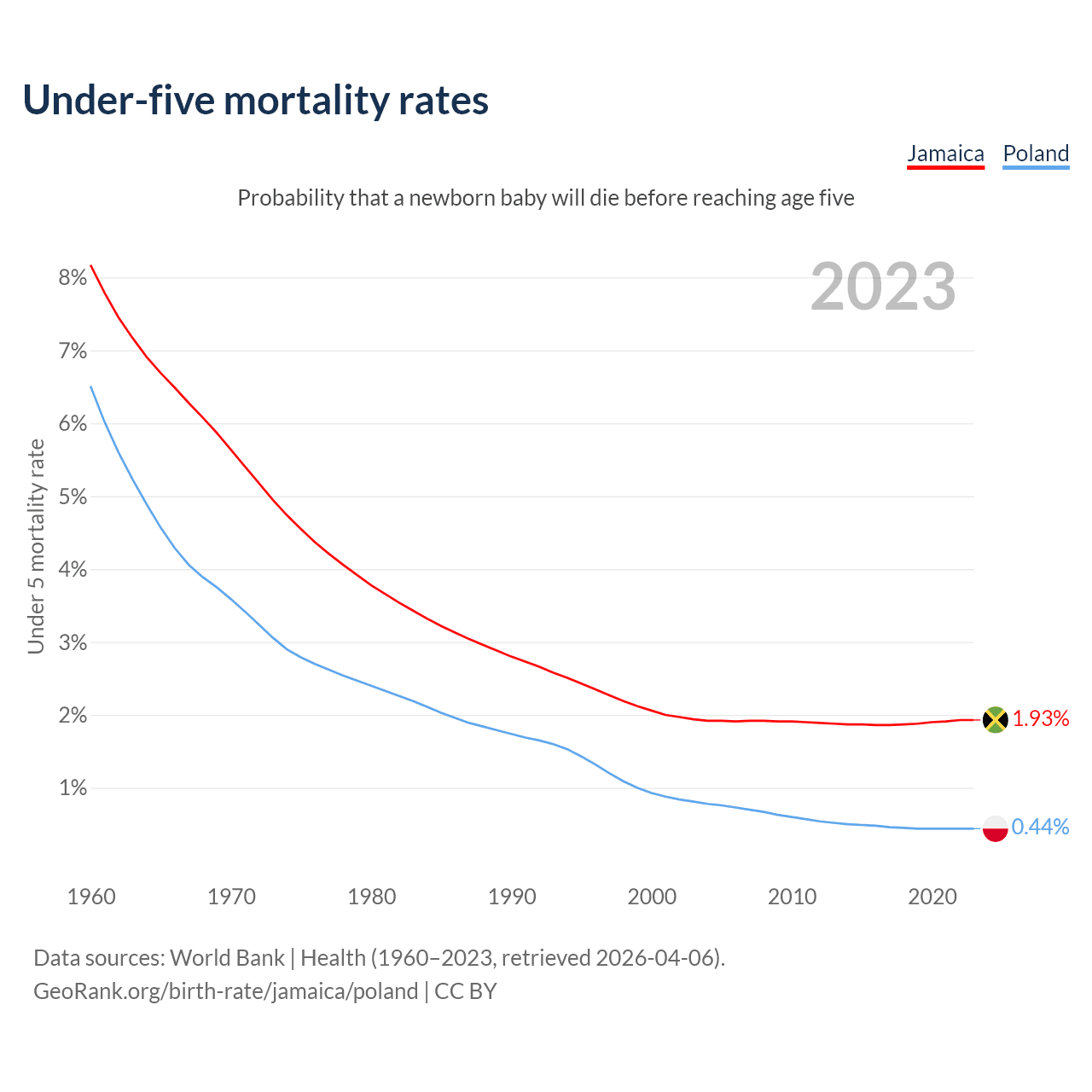 The chance that a newborn baby will die before reaching age five is 1.93% in Jamaica and 0.44% in Poland. Above is a chart with historical data on under-five mortality rates.