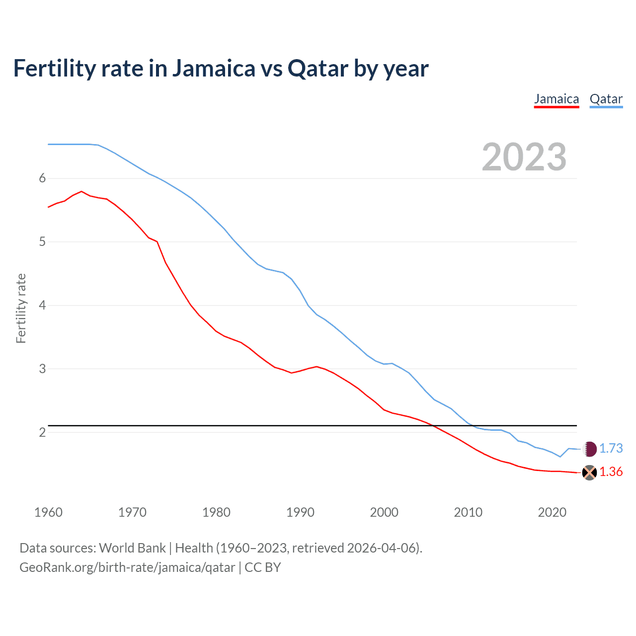 According to the latest available data on birth rates, the fertility rate in Jamaica was 1.36 children per woman in 2023, compared to 1.73 in Qatar in 2023. The replacement level is considered to be 2.1 children per woman.