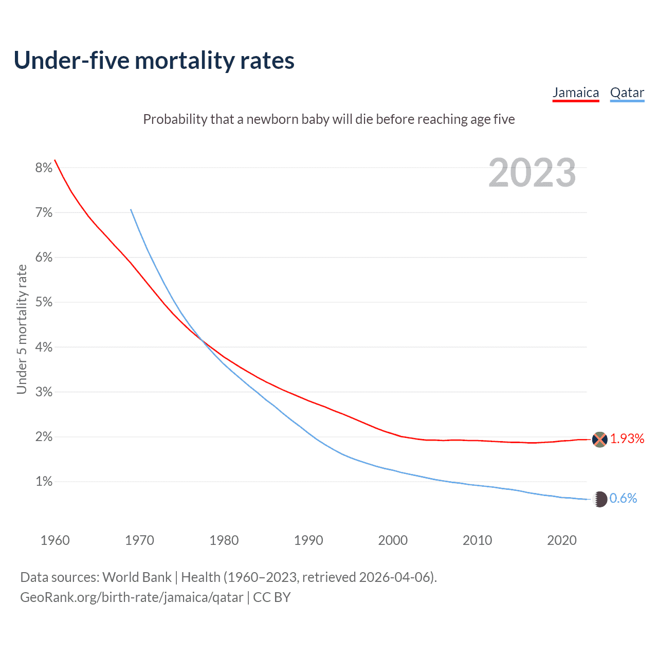 The chance that a newborn baby will die before reaching age five is 1.93% in Jamaica and 0.6% in Qatar. Above is a chart with historical data on under-five mortality rates.