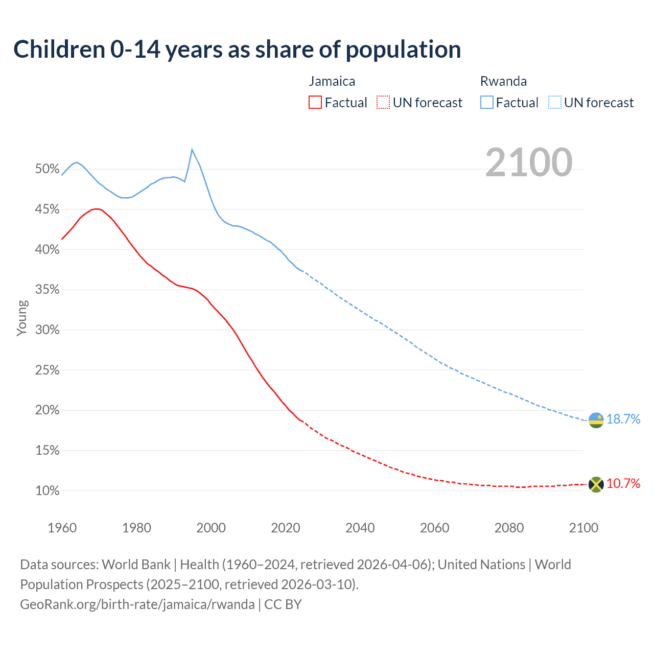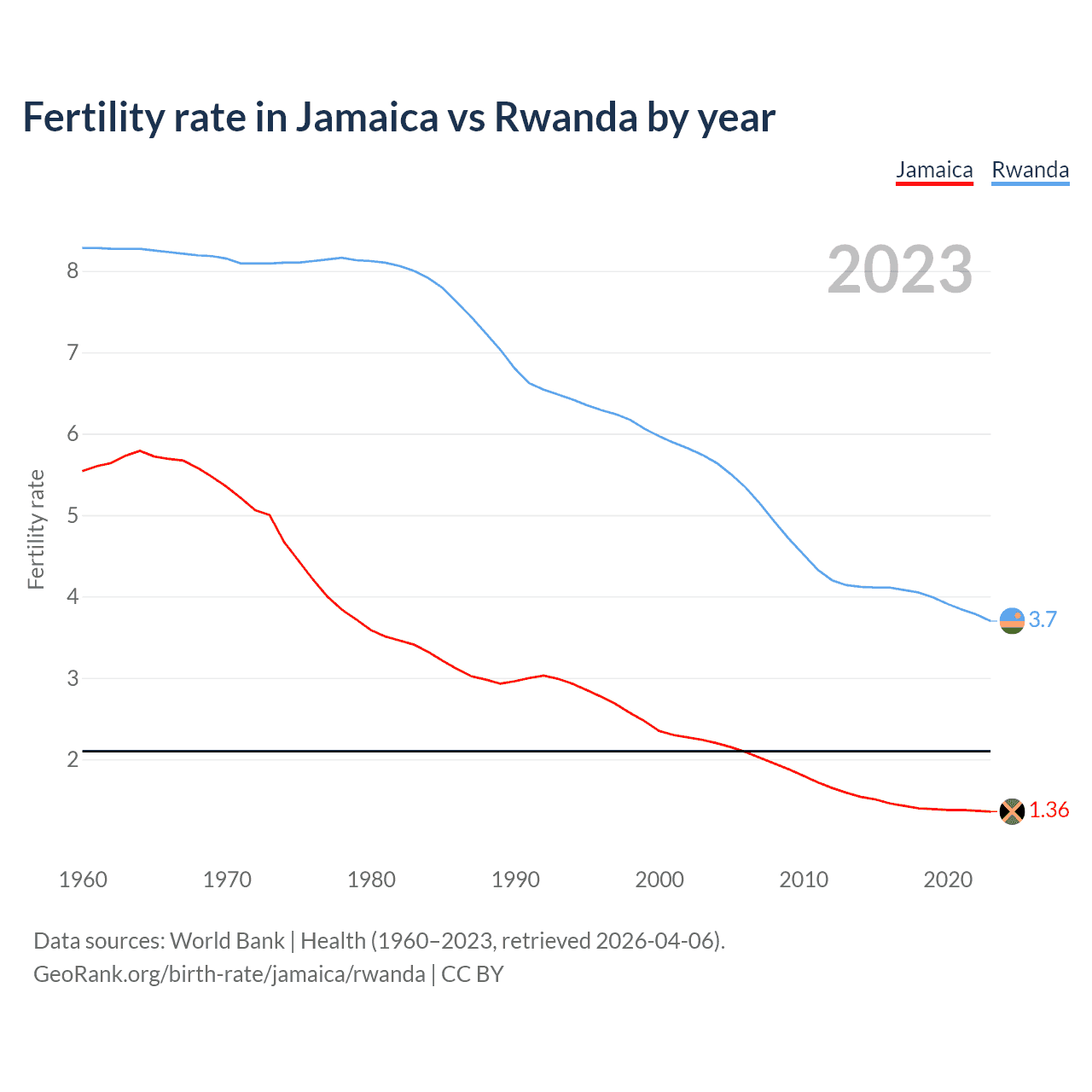 According to the latest available data on birth rates, the fertility rate in Jamaica was 1.36 children per woman in 2023, compared to 3.7 in Rwanda in 2023. The replacement level is considered to be 2.1 children per woman.