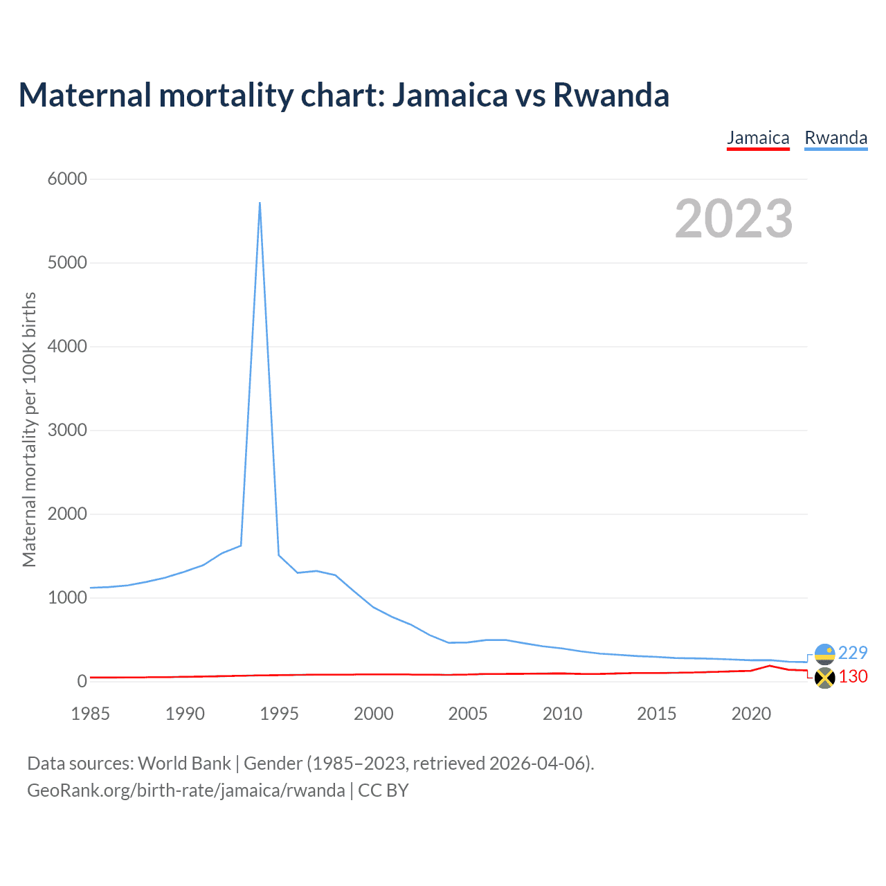 The maternal mortality rate, which is the probability of dying during childbirth or within 42 days of pregnancy termination, is 130 deaths per 100,000 live births in Jamaica, compared to 229 deaths in Rwanda.